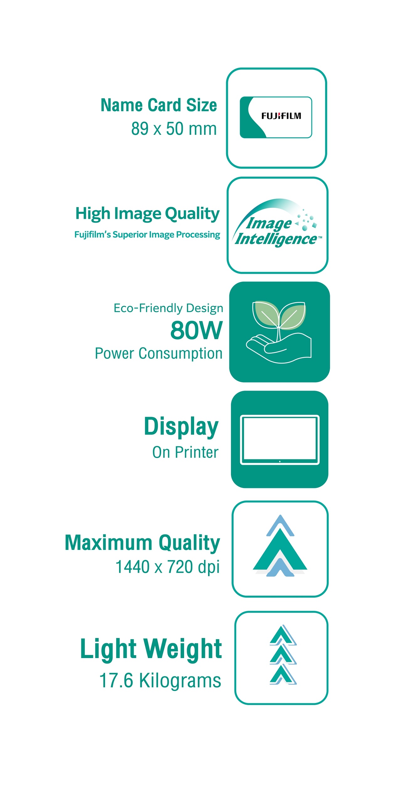 สุดยอดเครื่องพิมพ์ที่โดดเด่นทั้งความเร็วและคุณภาพงานพิมพ์: Frontier DX400 มาพร้อมกับเทคโนโลยีอิงก์เจ็ตขั้นสูงที่ประมวลผลได้อย่างรวดเร็วเพียง 9.4 วินาทีต่อแผ่น (ขนาด 4” x 6”) จึงรองรับงานพิมพ์ปริมาณมากได้อย่างมีประสิทธิภาพโดยเฉพาะกับอีเวนต์ขนาดใหญ่ และด้วยเทคโนโลยี Image Intelligence™ ของฟูจิฟิล์ม ทำให้ได้งานพิมพ์ที่สวยงามบนความละเอียดสูง พร้อมความแม่นยำและรายละเอียดสีที่ยอดเยี่ยม เหมาะสำหรับการพิมพ์ภาพถ่ายและงานที่ต้องการคุณภาพสูง