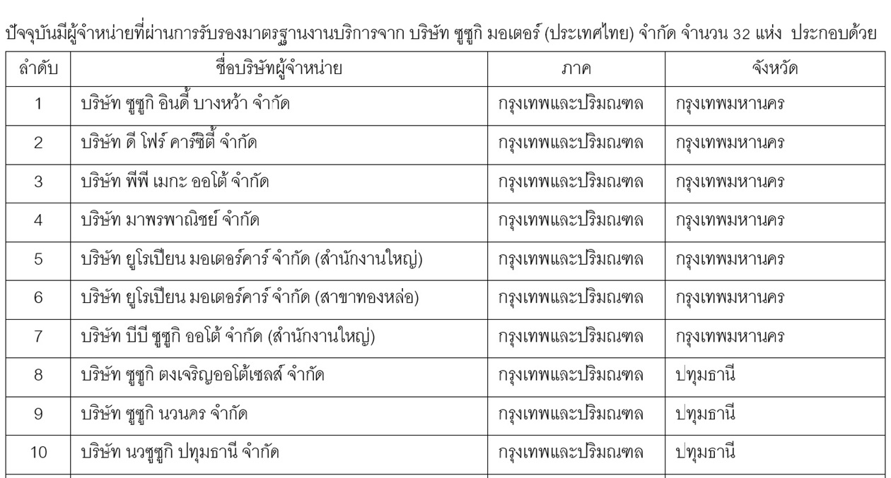 บริการอย่างมืออาชีพ : มั่นใจในบริการและการให้คำปรึกษาอย่างมืออาชีพเป็นมิตรและใส่ใจทุกรายละเอียดการซ่อมโดยช่างผู้มีความชำนาญที่ผ่านการรับรองมาตรฐานการอบรมในการซ่อมรถยนต์ซูซูกิ