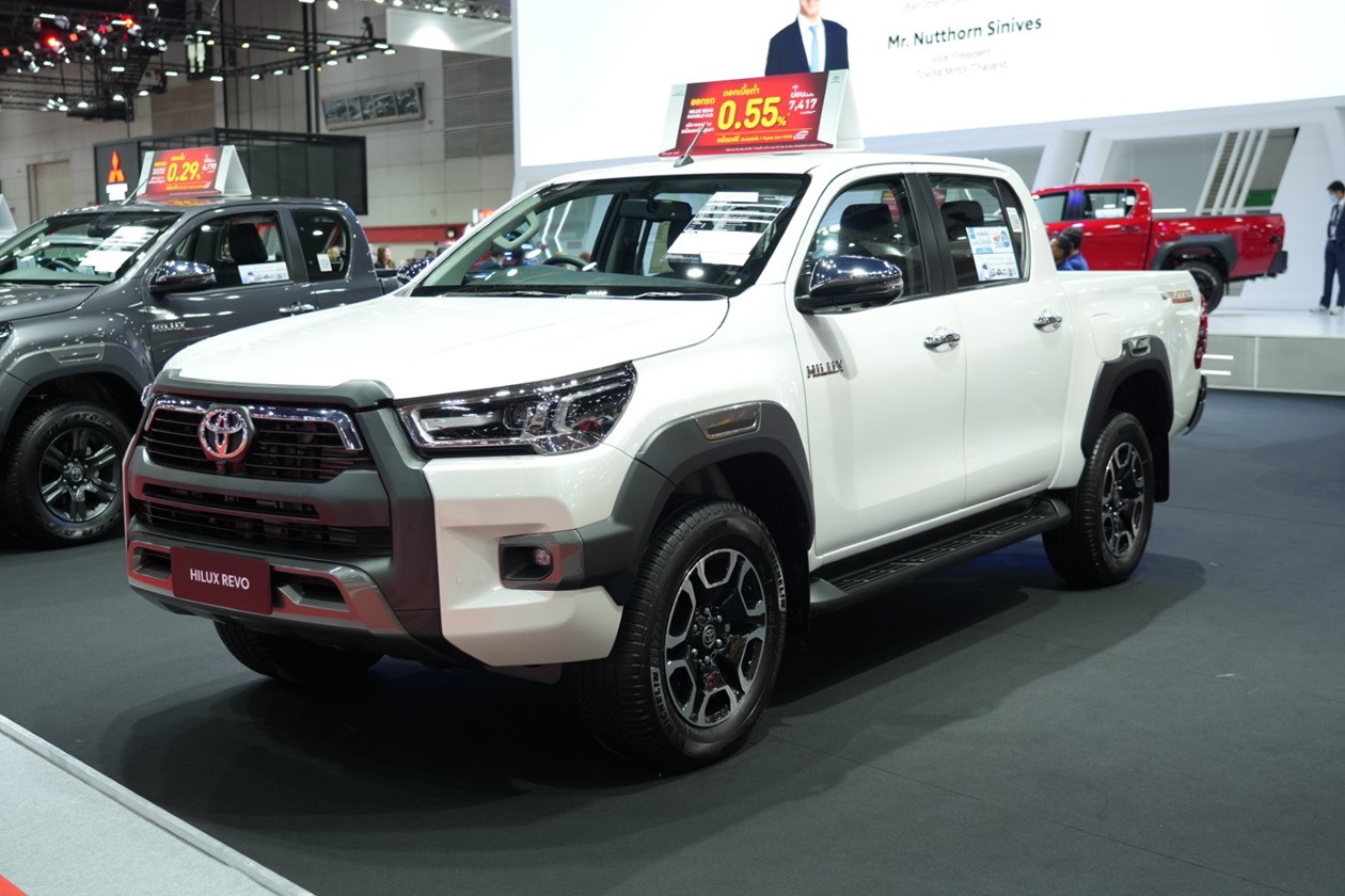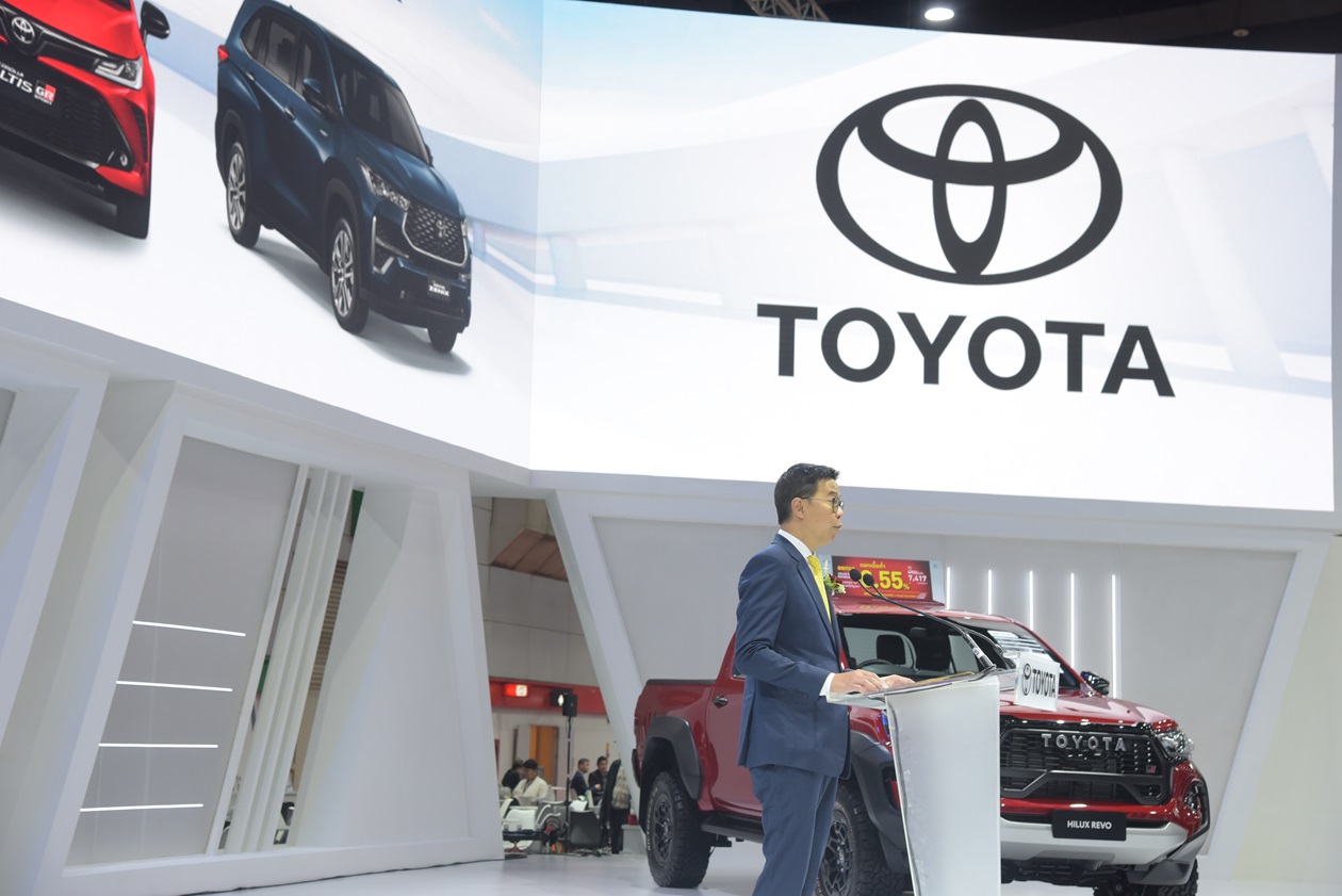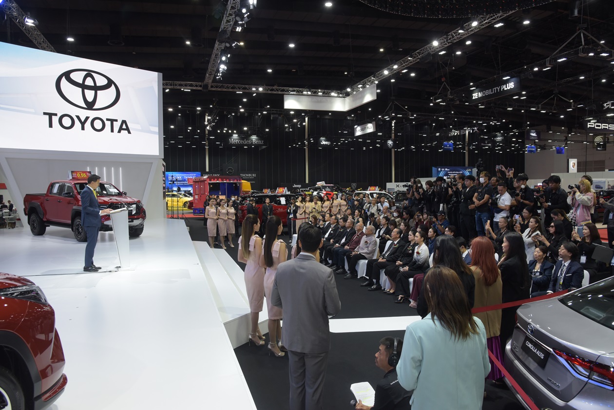 “และเรายังมีรถยนต์ยอดนิยมอีกหลายรุ่น ทั้ง Yaris ATIV, Yaris Hatchback และ Fortuner อีกทั้ง ยังมีรถยนต์อเนกประสงค์ 7 ที่นั่ง ที่สุดของเพื่อนคู่ใจสายครอบครัวระดับพรีเมียม INNOVA ZENIX และ Veloz มาให้ชมภายในงานนี้ด้วย ในส่วนของรถกระบะ นำทัพโดย Hilux Revo รุ่นปรับปรุงใหม่ ปี 2024 เริ่มจาก Hilux Revo GR-Sport 4x4 กระบะรุ่นเรือธงสมรรถนะเหนือชั้น ที่ผ่านบทพิสูจน์บนเส้นทางสุดทรหดในประเทศออสเตรเลีย และสามารถคว้าชัยชนะจากการแข่งขันสุดโหดในรายการ Asia Cross Country ที่เพิ่งจบไปเมื่อวันที่ 17 สิงหาคมที่ผ่านมา รุ่นต่อมาคือ Hilux Revo-D Prerunner และ Hilux Revo Smart Cab Prerunner ที่โดดเด่นด้วยช่วงล่างซับแรงกระแทกดีเยี่ยม มอบความสบายให้ทุกการเดินทาง และยังมี Hilux Revo Z-edition แต่งสนุก ถูกใจสายแต่งรถแน่นอนครับ สำหรับผู้ประกอบการต่างๆ เราขอนำเสนอ Hilux Champ กับแพ็กเกจต่อเติมรถ สร้างธุรกิจเคลื่อนที่ในฝันได้ ครบ จบ ในที่เดียว”