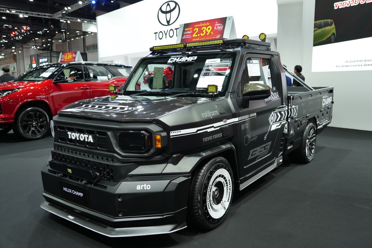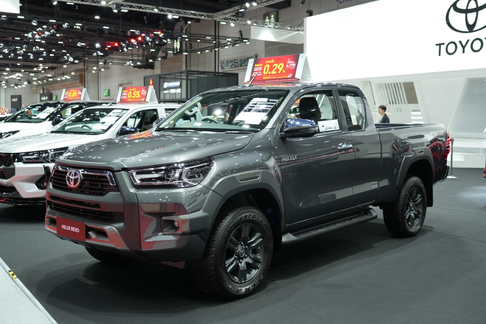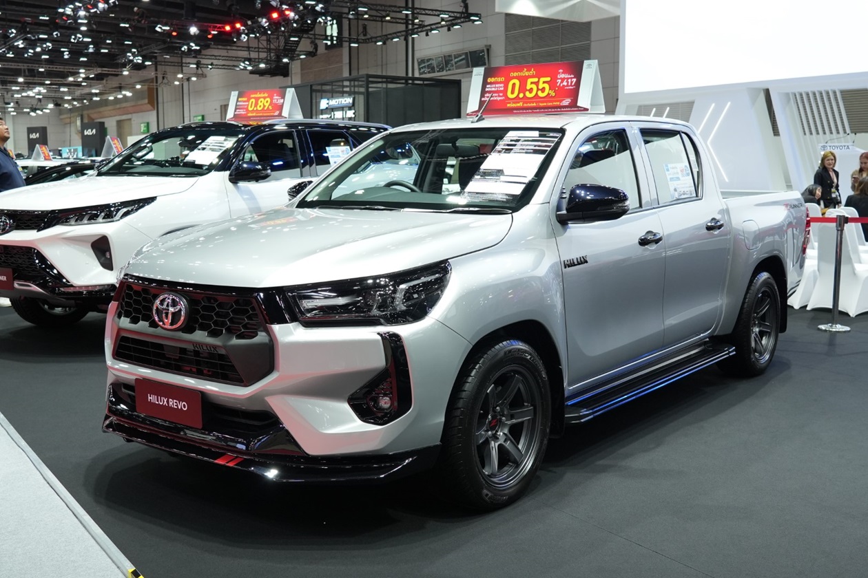 “และเรายังมีรถยนต์ยอดนิยมอีกหลายรุ่น ทั้ง Yaris ATIV, Yaris Hatchback และ Fortuner อีกทั้ง ยังมีรถยนต์อเนกประสงค์ 7 ที่นั่ง ที่สุดของเพื่อนคู่ใจสายครอบครัวระดับพรีเมียม INNOVA ZENIX และ Veloz มาให้ชมภายในงานนี้ด้วย ในส่วนของรถกระบะ นำทัพโดย Hilux Revo รุ่นปรับปรุงใหม่ ปี 2024 เริ่มจาก Hilux Revo GR-Sport 4x4 กระบะรุ่นเรือธงสมรรถนะเหนือชั้น ที่ผ่านบทพิสูจน์บนเส้นทางสุดทรหดในประเทศออสเตรเลีย และสามารถคว้าชัยชนะจากการแข่งขันสุดโหดในรายการ Asia Cross Country ที่เพิ่งจบไปเมื่อวันที่ 17 สิงหาคมที่ผ่านมา รุ่นต่อมาคือ Hilux Revo-D Prerunner และ Hilux Revo Smart Cab Prerunner ที่โดดเด่นด้วยช่วงล่างซับแรงกระแทกดีเยี่ยม มอบความสบายให้ทุกการเดินทาง และยังมี Hilux Revo Z-edition แต่งสนุก ถูกใจสายแต่งรถแน่นอนครับ สำหรับผู้ประกอบการต่างๆ เราขอนำเสนอ Hilux Champ กับแพ็กเกจต่อเติมรถ สร้างธุรกิจเคลื่อนที่ในฝันได้ ครบ จบ ในที่เดียว”