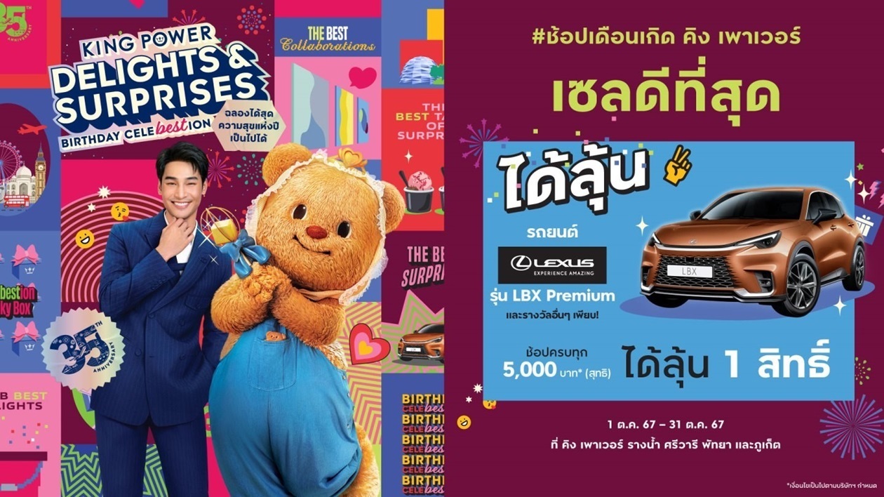 เลกซัส ประเทศไทย ร่วมเฉลิมฉลองครบรอบ 35 ปี คิง เพาเวอร์ มอบรถยนต์เลกซัสรุ่น LBX Premium มูลค่า 2.39 ล้านบาท สำหรับผู้โชคดี ในแคมเปญ “King Power 35th Anniversary Delights & Surprises” “Birthday Celebestion ฉลองได้สุด ความสุขแห่งปี เป็นไปได้” ต่อเนื่องเป็นปีที่ 2 เมื่อช้อปครบ 5,000 บาท พร้อมสิทธิพิเศษ และโปรโมชั่นสุดคุ้มแห่งปี ตลอดเดือนตุลาคม 2567