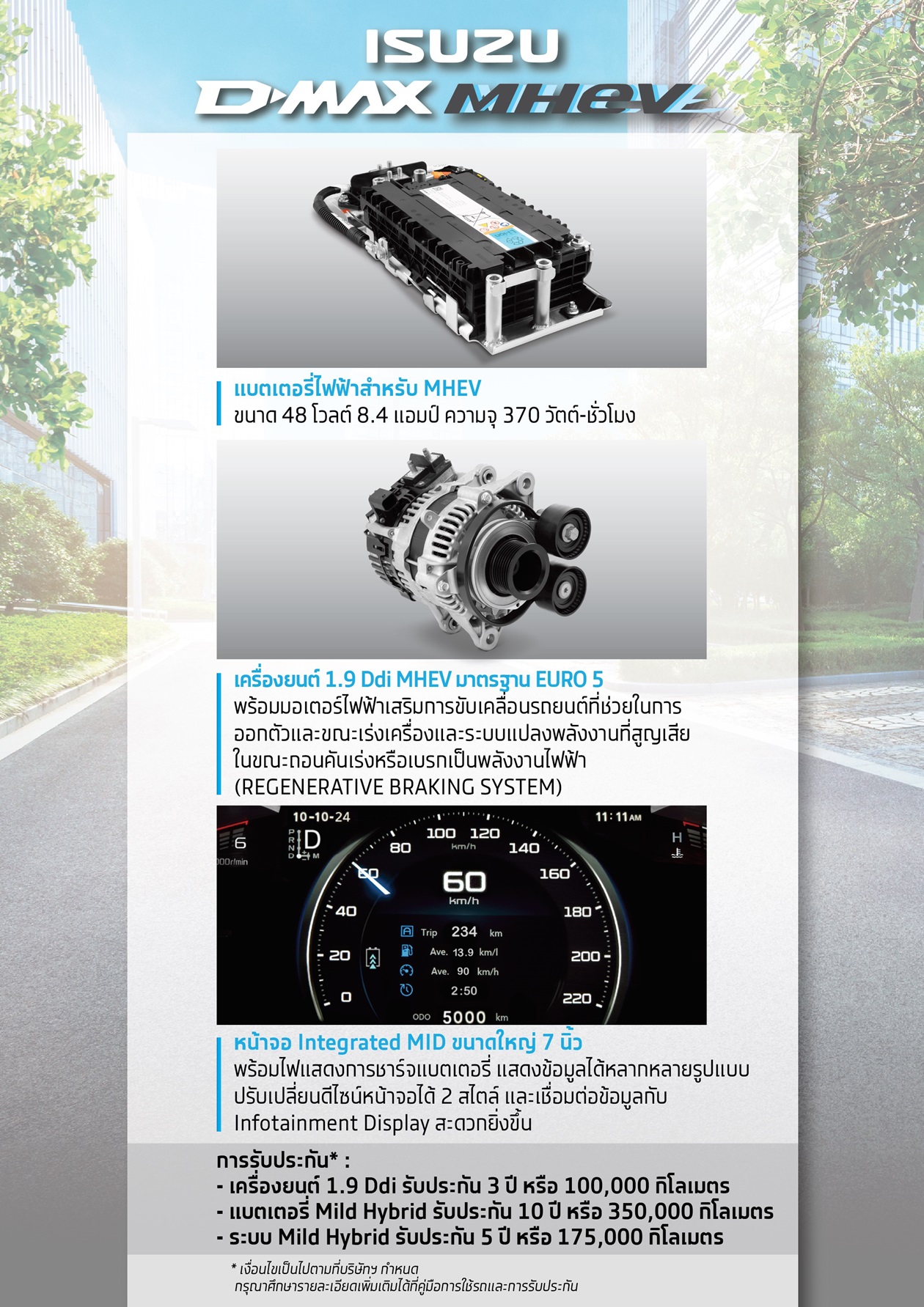 อีซูซุส่งรถปิกอัพ “Isuzu D-Max MHEV” ทางเลือกใหม่…เพื่อโลกที่ดีขึ้น กับเทคโนโลยี Mild Hybrid ตอบสนองการขับขี่ที่ดีขึ้น ทั้งด้านการออกตัว การประหยัดน้ำมัน และเป็นมิตรกับสิ่งแวดล้อม ด้วยเครื่องยนต์ 1.9 ดีดีไอ บลูเพาเวอร์ รุ่น “Isuzu D-Max Hi-lander 1.9 Ddi MHEV” เกรด M เกียร์อัตโนมัติ สีขาวมุก โดโลไมท์ ราคา 1,145,000 บาท เริ่มจำหน่ายวันที่ 20 พฤศจิกายน 2567 พร้อมสานต่อ “นโยบายความเป็นกลางทางคาร์บอนในระดับโลกและระดับประเทศ” ผ่าน “โซลูชั่นส์อันหลากหลายสู่ความเป็นกลางทางคาร์บอน” (Multi-pathways to Carbon Neutrality)