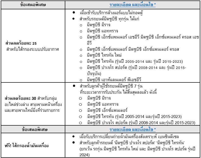 ในช่วงปลายฤดูฝน ความชื้นของสภาพอากาศอาจทำให้เกิดความอับชื้นในห้องโดยสาร และ ปัญหาเรื่องฝุ่นละออง PM2.5 ที่เกิดในช่วงเวลานี้ส่งผลกระทบต่อคุณภาพอากาศ ดังนั้นการล้างแอร์รถยนต์จึงเป็นสิ่งที่จำเป็นที่ไม่ควรละเลย มิตซูบิชิ มอเตอร์ส พร้อมมอบส่วนลดร้อยละ 25 สำหรับไส้กรองระบบปรับอากาศ เมื่อเข้ารับบริการล้างแอร์แบบ ไม่ถอดตู้ และพิเศษยิ่งขึ้น สำหรับลูกค้ารถยนต์ ‘มิตซูบิชิ ปาเจโร สปอร์ต’ และ ‘มิตซูบิชิ ไทรทัน’ (ยกเว้น รถรุ่น มิตซูบิชิ ไทรทัน ใหม่ และมิตซูบิชิ ปาเจโร สปอร์ต รุ่นปี 2024) ฟรี! ไส้กรองน้ำมันเครื่องเมื่อรับบริการเปลี่ยนถ่ายน้ำมันเครื่องสังเคราะห์เบนซินดีเซล นอกจากนี้ การตรวจเช็คความพร้อมและสมรรถนะของรถยนต์อย่างสม่ำเสมอ จะเพิ่มความ อุ่นใจให้กับผู้ใช้รถขณะเดินทางท่องเที่ยวให้เพลิดเพลินกับช่วงเวลาที่แสนพิเศษกับครอบครัวได้อย่างเต็มที่ มิตซูบิชิ จึงมอบส่วนลดร้อยละ 30 สำหรับกลุ่มอะไหล่ช่วงล่าง สายพานหน้าเครื่อง และสายพานไทม์มิ่งที่ร่วมรายการ สำหรับรถยนต์มิตซูบิชิที่สิ้นสุดระยะเวลาการรับประกัน โดยลูกค้าสามารถเข้ารับบริการได้ที่ศูนย์บริการทั่วประเทศที่พร้อมให้บริการด้วยมาตรฐานสูงสุด โดยช่างผู้ชำนาญงานที่ได้รับการฝึกอบรม และอะไหล่แท้จากมิตซูบิชิ มอเตอร์ส ภายใต้สโลแกน ‘เราดูแล...คุณแค่ขับ’ ตั้งแต่วันนี้ จนถึงวันที่ 31 ธันวาคม 2567