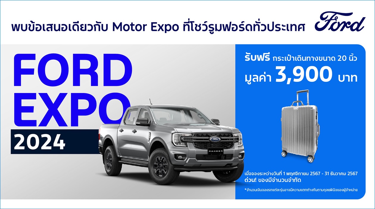 กรุงเทพฯ ประเทศไทย 4 พฤศจิกายน 2567 – ฟอร์ด ประเทศไทย จัดแคมเปญสุดคุ้มส่งท้ายปี ‘ฟอร์ด เอ็กซ์โป’ มอบข้อเสนอเดียวกับงานมอเตอร์ เอ็กซ์โป สำหรับรถฟอร์ดหลากหลายรุ่นเพื่อให้ตอบโจทย์การใช้งานทุกรูปแบบด้วยข้อเสนอสุดเร้าใจมากมาย อาทิ ฟอร์ด เรนเจอร์ XLS รุ่นใหม่ล่าสุด ราคาพิเศษช่วงเปิดตัวเพียง 799,000 บาท ฟอร์ด เอเวอเรสต์ เทรนด์ ราคาพิเศษ 1,249,000 บาท ฟอร์ด เรนเจอร์ แร็พเตอร์ ดอกเบี้ย 0.99% พิเศษ! เมื่อลูกค้าจองรถฟอร์ดรุ่นใดก็ได้ ระหว่างวันที่ 1 พฤศจิกายน ถึง 31 ธันวาคม 2567 ที่โชว์รูมฟอร์ดทั่วประเทศ รับฟรี กระเป๋าเดินทางฟอร์ดดีไซน์หรู มูลค่า 3,900 บาท