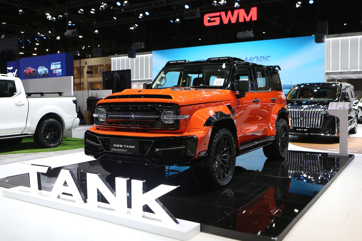 GWM TANK 300 HEV คันแรกและคันเดียวในไทยที่ เกรท วอลล์ มอเตอร์ จัดชุดแต่งมาให้แบบเต็มสูบ เพื่อส่งมอบแรงบันดาลใจให้บรรดาผู้ที่ชื่นชอบการมองหาประสบการณ์ใหม่ ๆ ได้ออกไปลุยเพื่อเปิดโสตประสาทในทุกด้าน และเติมเต็มสัญชาตญาณการผจญภัย กับการปรับแต่งอัพลุคให้ดูแข็งแกร่ง ดุดัน ในสีส้มหลังคาดำสุดชิค พร้อมลุยในทุกเส้นทางมากยิ่งขึ้น ด้วยชุดแต่งมูลค่ารวมเกือบครึ่งล้านบาท พร้อมกับชุดแต่งรวมสีรอบคันแสดงความดุดันได้อย่างชัดเจน ทั้งฝากระโปรงใหม่ขนาดใหญ่ กระจังหน้าใหม่พร้อมเส้นไฟคาดยาวระหว่างไฟหน้าซ้าย-ขวา กันชนหน้า-หลังและซุ้มล้อที่ปรับแต่งให้ดูเท่และบึกบึนไปอีกขั้น พร้อมลูกเล่นสุดว้าวด้วยไฟสปอร์ตไลต์บนหลังคาและบันไดข้างไฟฟ้าพร้อมไฟ LED หลากสีสะท้อนความโมเดิร์นแต่แข็งแกร่ง ล้อฟอร์จขนาด 20 นิ้ว ซึ่งเป็นล้อแม็กน้ำหนักเบาที่มีความแข็งแรงทนทานสูงกว่าล้อแม็กทั่วไป และยาง AMP 3x12 50R20 ที่พร้อมลุยในทุกสถานการณ์ โดย GWM TANK 300 HEV ในลุค Exploring, Yet Remarkably Unique นี้ สามารถสะท้อนเอกลักษณ์ความเท่ทั้งรถยนต์รุ่นนี้และผู้ขับขี่ได้อย่างชัดเจนไม่เหมือนใคร สามารถสะกดทุกสายตาของผู้เข้าเยี่ยมชมบูธได้อย่างยอดเยี่ยม ให้จับจ้องทั้งออนโรด-ออฟโรด