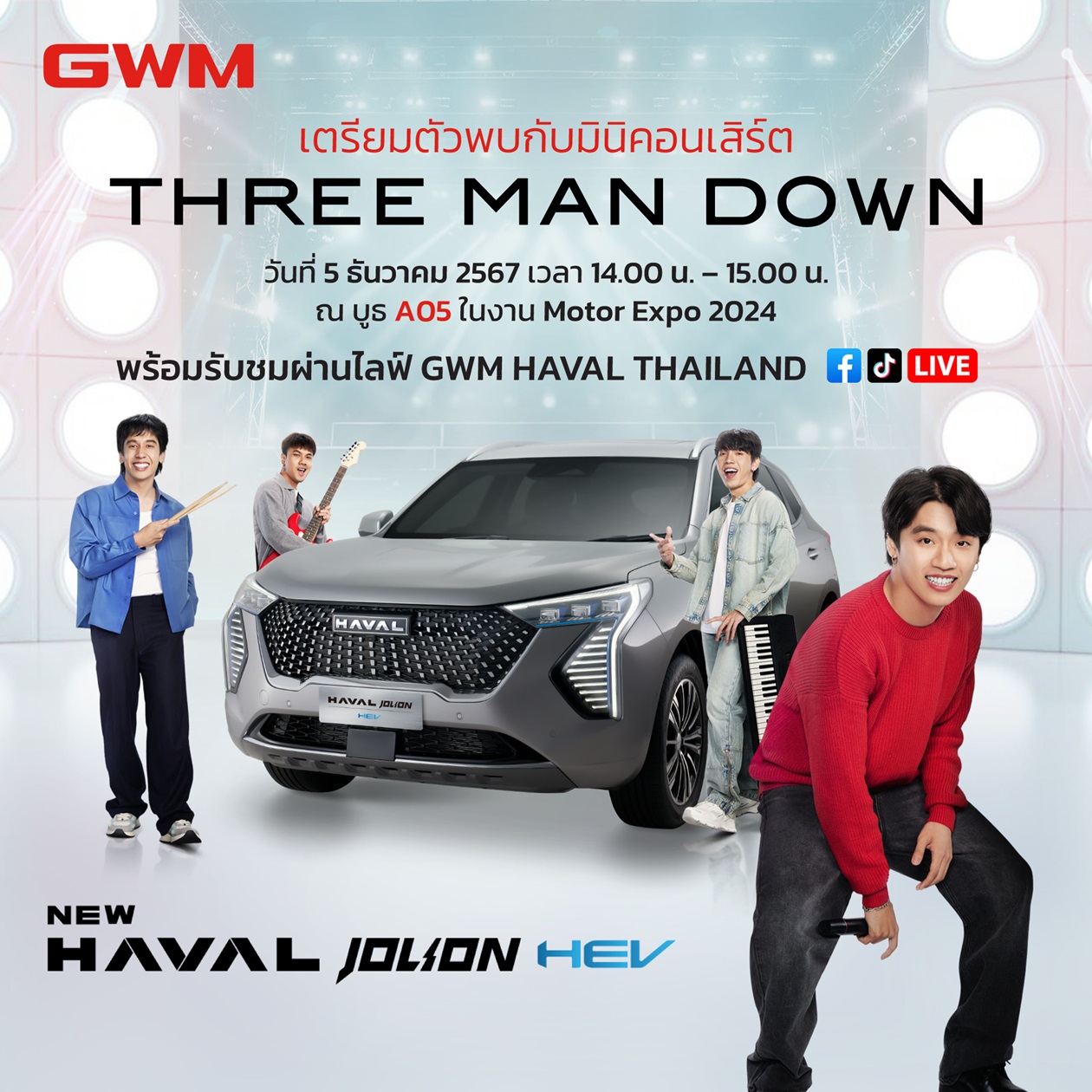 โดย Three Man Down เป็นตัวแทนของกลุ่มคนรุ่นใหม่ที่เต็มไปด้วยสปิริตและจิตวิญญาณแห่งความกล้าหาญ และมุ่งมั่นเพื่อเติมเต็มความฝัน พร้อมทำสิ่งที่ตนเองรักจนประสบความสำเร็จ โดยวันพฤหัสบดีที่ 5 ธันวาคมนี้ ทั้งสี่หนุ่ม กิต-เต-ตูน-เส็ง เตรียมขนแรงบันดาลใจผ่านบทเพลงฮิตทั้ง 5 เพลง เพื่อส่งมอบให้แฟนๆ ได้ออกไปเร่งเครื่องตามล่าสร้างฝันให้เป็นจริง งานนี้ Three Man Down เล่นใหญ่ จัดเพลงใหม่ที่แต่งขึ้นเป็นพิเศษ “ให้เธอนั่งข้าง ๆ” เตรียมไปรอกรี๊ดกันได้ ณ บูธ เกรท วอลล์ มอเตอร์ ในวันที่ 5 ธันวาคม 2567 เวลา 14.00 – 15.00 น.
