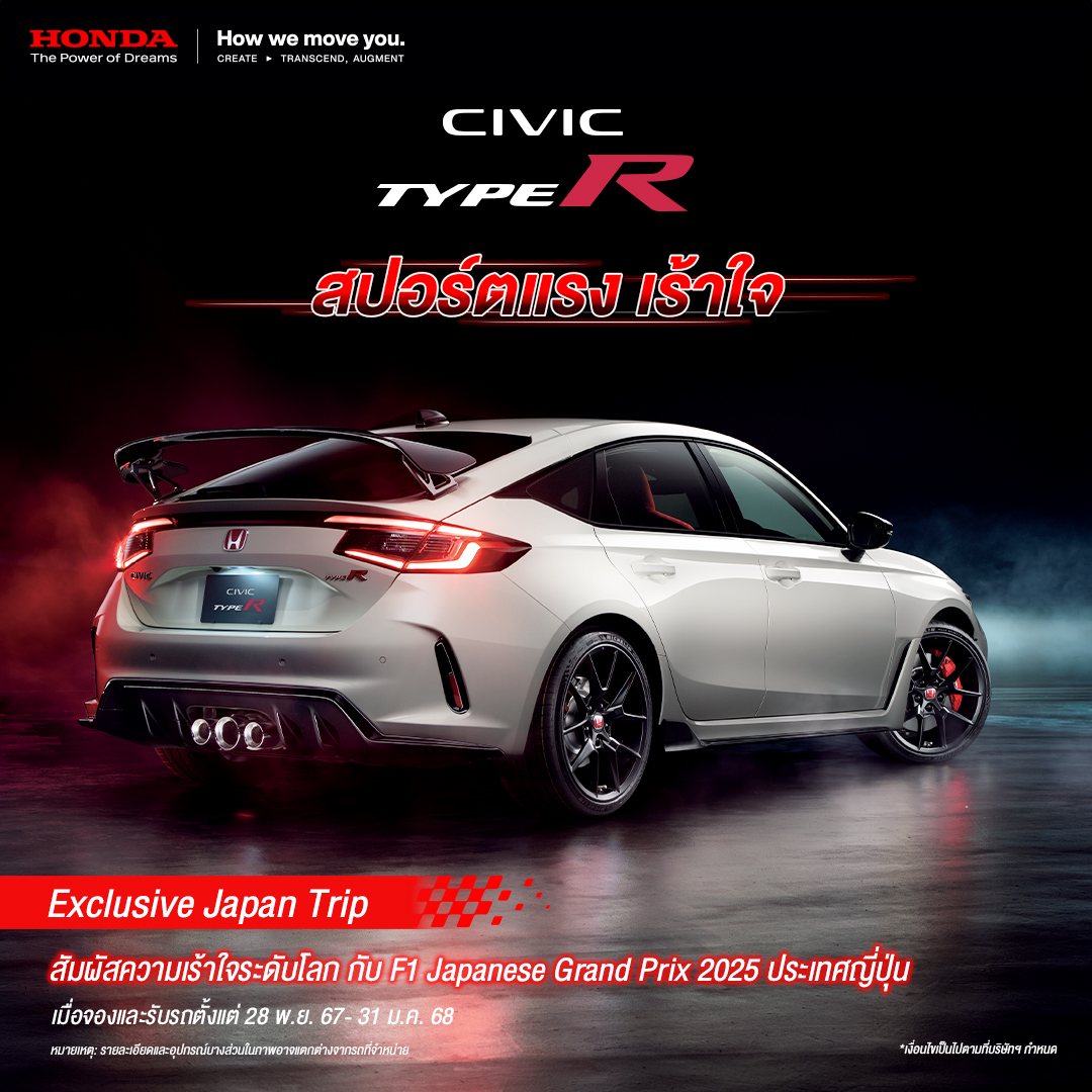 (กรุงเทพฯ – 9 ธันวาคม 2567) บริษัท ฮอนด้า ออโตโมบิล (ประเทศไทย) จำกัด ชวนลูกค้าที่ชื่นชอบ ในจิตวิญญาณความสปอร์ต ร่วมเป็นเจ้าของ ฮอนด้า ซีวิค ไทป์ อาร์ พร้อมมอบทริปสุดเอกซ์คลูซีฟ รับปีใหม่ ร่วมชม F1 Japanese Grand Prix 2025 ที่ Suzuka Circuit จังหวัดมิเอะ ประเทศญี่ปุ่น