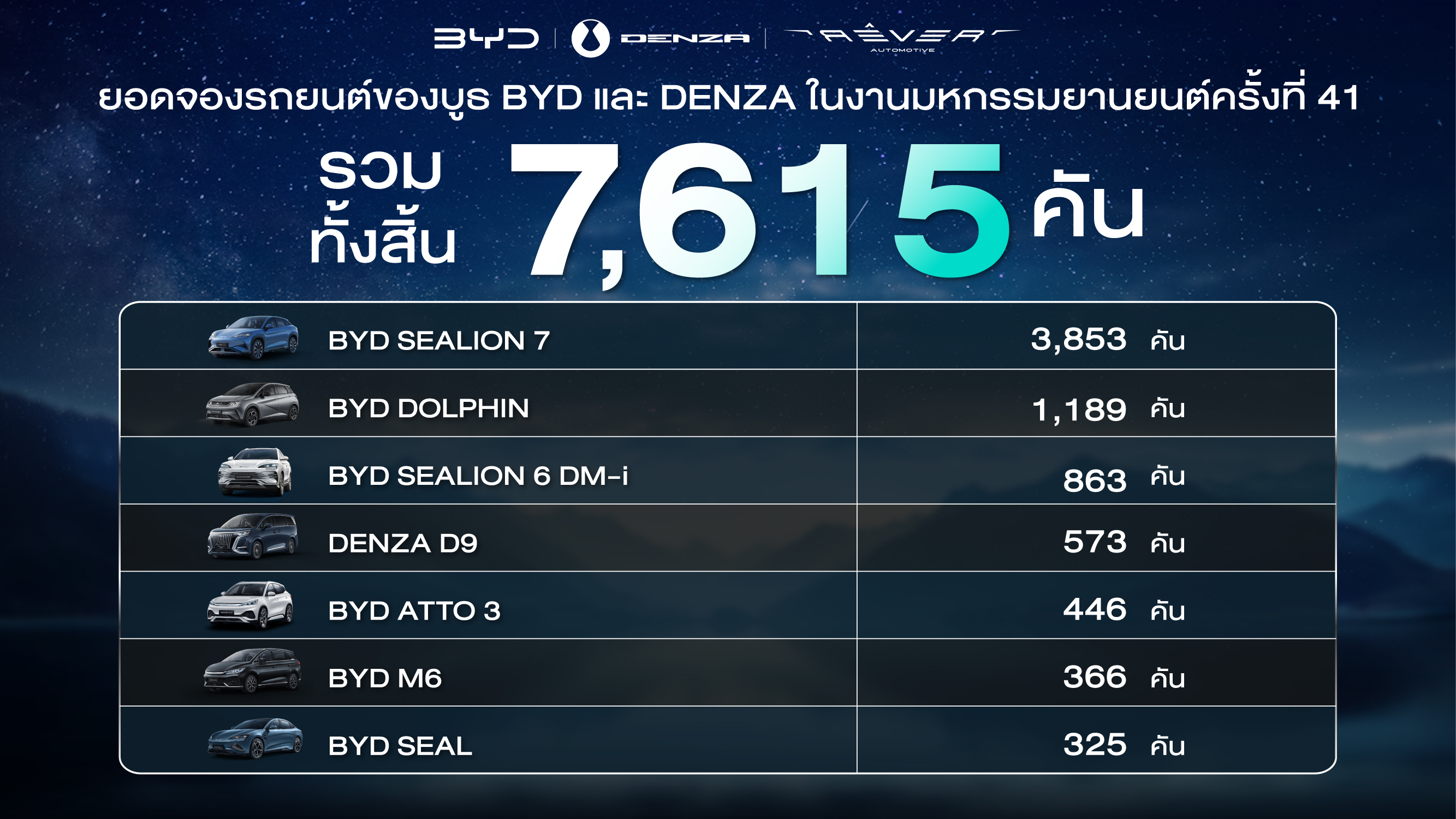 ยอดจองรายรุ่นของ BYD และ DENZA ในงานมหกรรมยานยนต์ครั้งที่ 41
