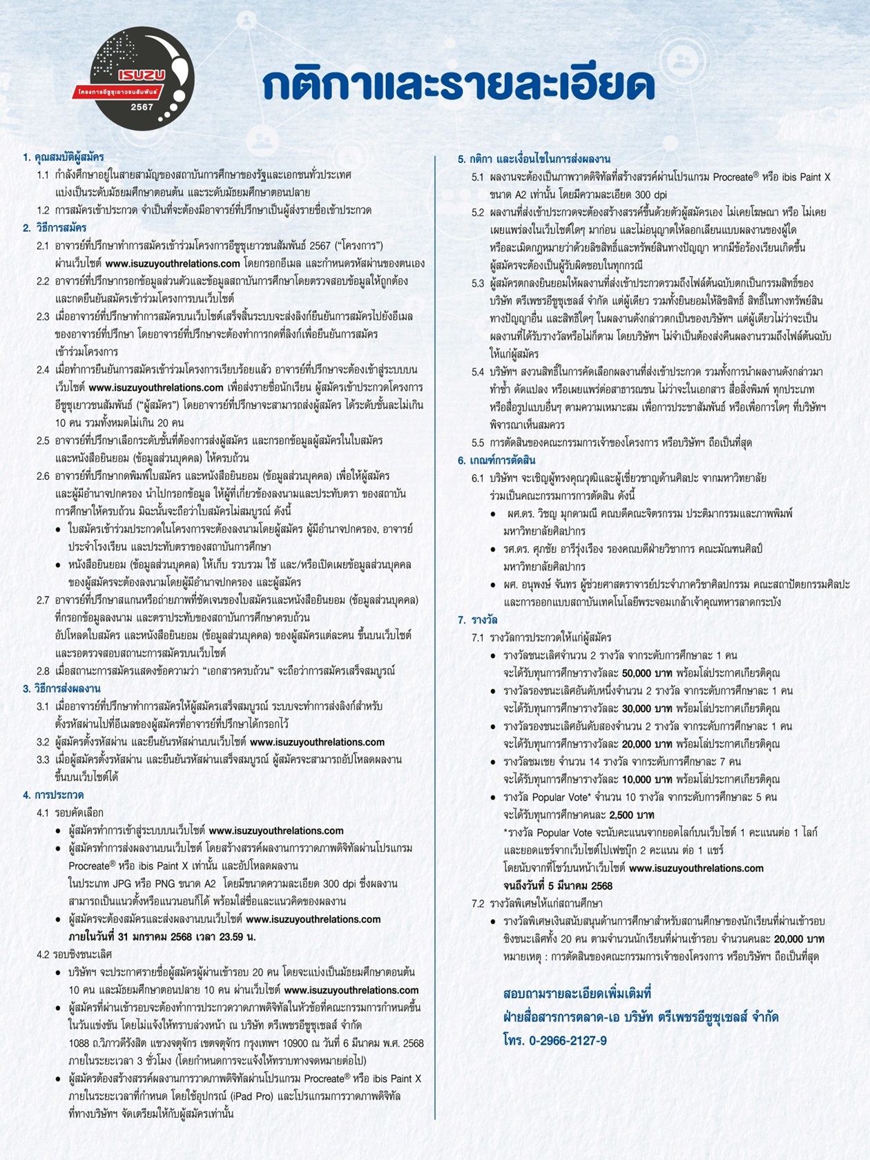 ผู้ที่สนใจสามารถหาข้อมูล และสมัครเข้าร่วมการประกวดวาดภาพดิจิทัล ในโครงการ “อีซูซุเยาวชนสัมพันธ์ 2567” ได้ที่ www.isuzuyouthrelations.com หรือสอบถามรายละเอียดเพิ่มเติมที่แผนกสื่อสารการตลาด-เอ บริษัท ตรีเพชรอีซูซุเซลส์ จำกัด โทร. 0-2966-2127-9