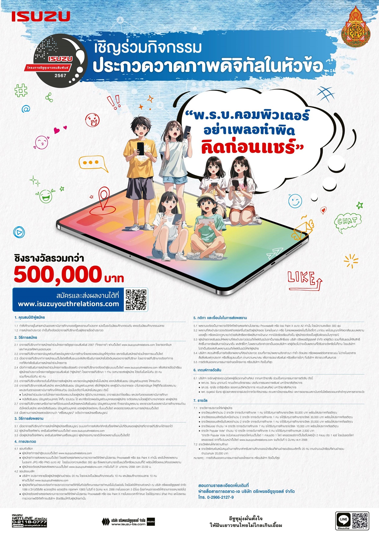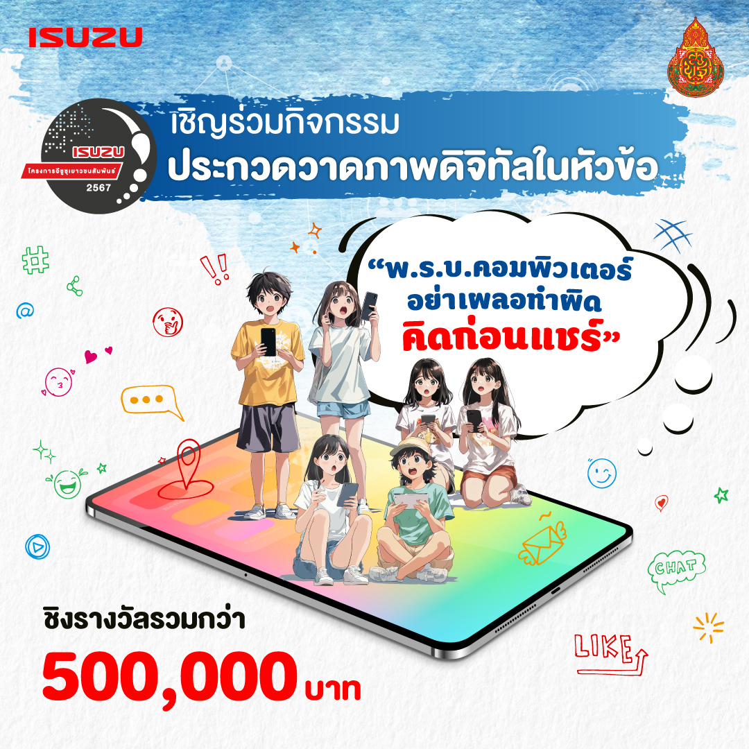 อีซูซุร่วมกับสำนักงานคณะกรรมการการศึกษาขั้นพื้นฐาน (สพฐ.) เดินหน้าจุดประกายความคิดสร้างสรรค์ทางด้านศิลป์กับเยาวชนคนรุ่นใหม่ และสร้างความตระหนักรู้เกี่ยวกับ พ.ร.บ.ว่าด้วยการกระทำความผิดเกี่ยวกับคอมพิวเตอร์ ผ่านการจัดประกวดวาดภาพรูปแบบดิจิทัลในโครงการ “อีซูซุเยาวชนสัมพันธ์” ประจำปี 2567 โดยเชิญชวนนักเรียนระดับมัธยมศึกษาสายสามัญทั่วประเทศ ร่วมส่งผลงานรูปแบบดิจิทัลสุดสร้างสรรค์ในรอบคัดเลือก ภายใต้หัวข้อ “พ.ร.บ.คอมพิวเตอร์ อย่าเผลอทำผิด คิดก่อนแชร์” ผ่านเว็บไซต์ www.isuzuyouthrelations.com ตั้งแต่วันนี้ – 31 มกราคม 2568 ชิงรางวัลทุนการศึกษาพร้อมโล่ประกาศเกียรติคุณ มูลค่ารวมกว่า 500,000 บาท