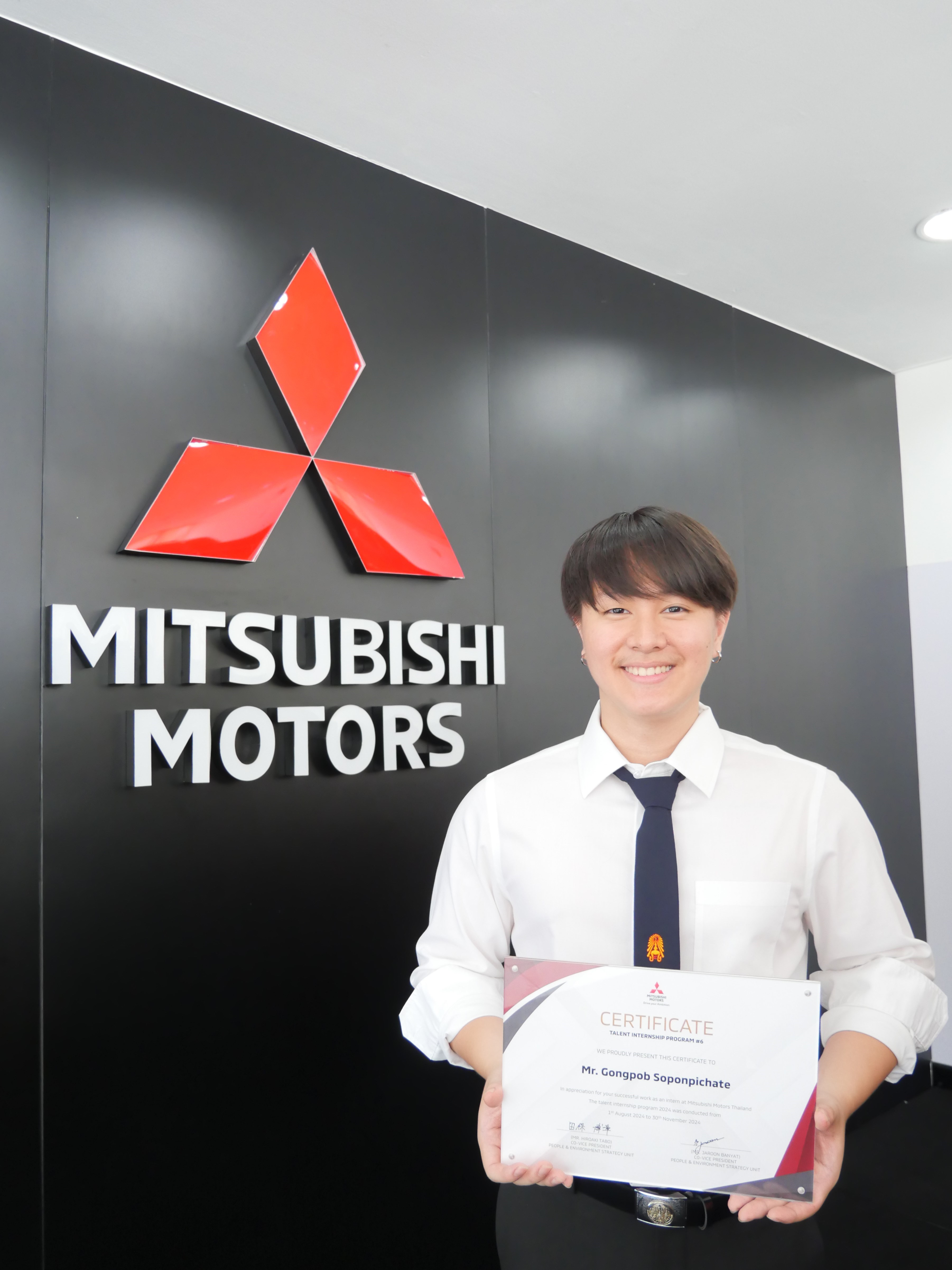 นาย ก้องภพ โสภณพิเชฐ นักศึกษาฝึกงานคณะวิศวกรรมศาสตร์ สาขาวิศวกรรมเมคคาทรอนิกส์ สถาบันเทคโนโลยีพระจอมเกล้าเจ้าคุณทหารลาดกระบัง กล่าวว่า “ประสบการณ์ที่ได้รับจากบริษัทฯ นั้นมีประโยชน์และมีคุณค่า โดยบริษัทฯ ได้เปิดโอกาสให้ทดลองฝึกแก้ปัญหาจากสถานการณ์จริง ได้เพิ่มองค์ความรู้ในสายงานวิศวกรรมตามที่สนใจ พร้อมทั้งได้รับคำแนะนำจากผู้เชี่ยวชาญในสายงาน ทำให้ประสบการณ์การฝึกงานในครั้งนี้เต็มไปด้วยความสนุกสนาน ได้ความรู้ และรู้สึกภาคภูมิใจมากที่ได้ฝึกงานที่มิตซูบิชิ มอเตอร์ส ประเทศไทย”
