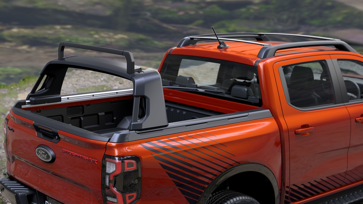 กรณีต้องบรรทุกของที่มีลักษณะยาว บางครั้งต้องติดตั้งแร็คหลังคาเสริมบนรถกระบะ ทำให้ต้องมีค่าใช้จ่ายเพิ่มเติม เจ้าของรถที่จำเป็นต้องบรรทุกอุปกรณ์ เช่น ลองบอร์ด เรือคายัค หรือไม้อยู่บ่อยครั้ง จะใช้ประโยชน์จากราวหลังคาและสปอร์ตบาร์แบบปรับได้ (Flexible Rack System)1,2 ที่ติดตั้งมากับฟอร์ด เรนเจอร์ สตอร์มแทรคได้อย่างมีประสิทธิภาพ โดยสามารถปรับรูปแบบสปอร์ตบาร์ด้วยการเลื่อนจุดล็อคได้ 5 ตำแหน่งด้วยมือเดียว