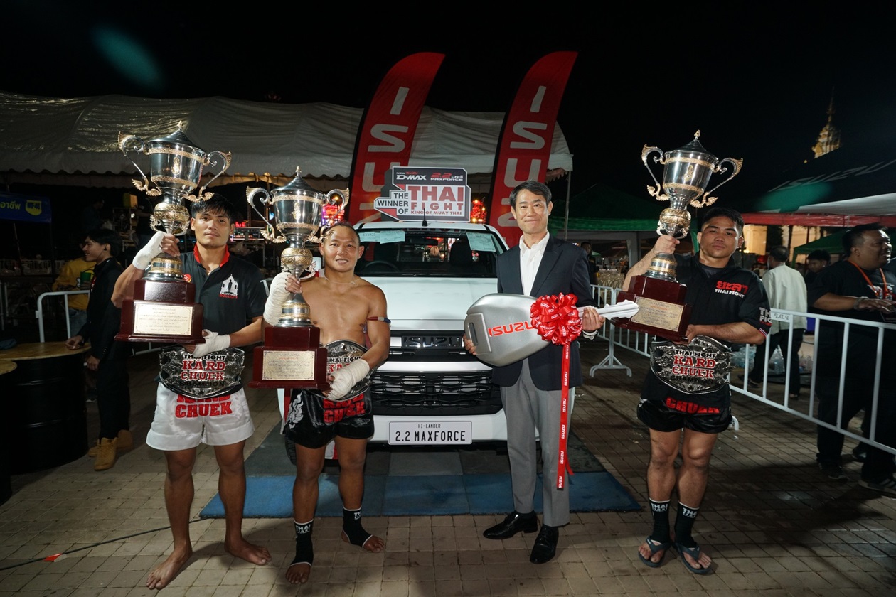 มร. ทาคาชิ ฮาตะ กรรมการผู้จัดการ บริษัท ตรีเพชรอีซูซุเซลส์ จำกัด แสดงความยินดีกับ 3 สุดยอดนักชกไทยผู้คว้าแชมป์ THAI FIGHT 2024 รอบชิงชนะเลิศในงาน “THAI FIGHT พะเยา” ได้ครองถ้วยพระราชทานในพระบาทสมเด็จพระเจ้าอยู่หัว และได้รับรางวัลชนะเลิศรถปิกอัพรุ่นใหม่ล่าสุด “ใหม่! อีซูซุ ดีแมคซ์ ไฮแลนเดอร์ 2.2 Ddi MAXFORCE รุ่น 2 ประตู” จำนวน 3 คัน พร้อมเงินสดมูลค่ารางวัลรวมกว่า 4 ล้านบาท ณ บริเวณลานอนุสาวรีย์พ่อขุนงำเมือง จังหวัดพะเยา