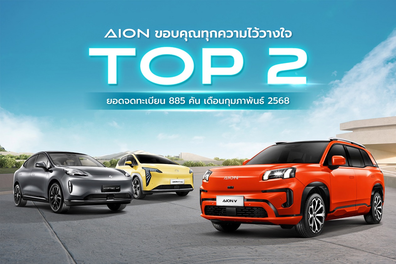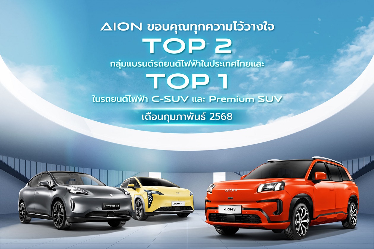AION Thailand สร้างปรากฏการณ์ยอดจดทะเบียนในเดือนกุมภาพันธ์ 2568 คว้าตำแหน่งยอดจดทะเบียนอันดับ 1 และอันดับ 2 ในกลุ่มรถยนต์ไฟฟ้า C-SUV ในรุ่น AION V และ AION Y Plus ตามลำดับ และคว้าตำแหน่ง ยอดจดทะเบียนอันดับ 1 รถยนต์ไฟฟ้า Premium SUV ในรุ่น HYPTEC HT สะท้อนถึงความเชื่อมั่นจากผู้บริโภคชาวไทย ที่ไว้วางใจและเลือกใช้รถยนต์ไฟฟ้าอัจฉริยะ AION และ HYPTEC