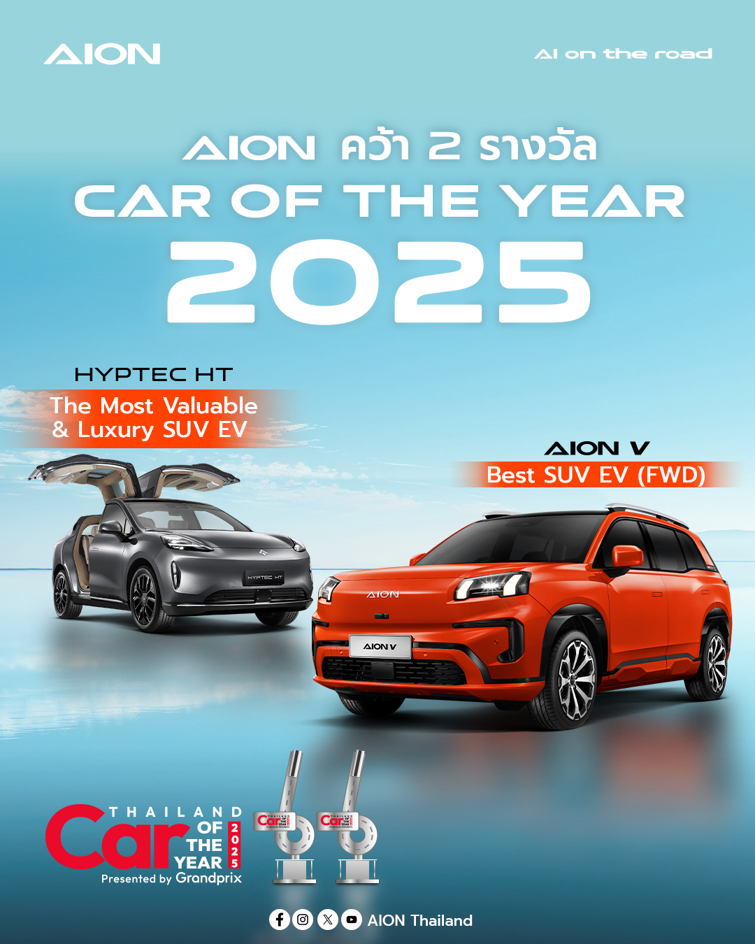 เมื่อวันที่ 7 มีนาคมที่ผ่านมา AION Thailand ได้รับรางวัลรถยนต์ยอดเยี่ยมแห่ง CAR OF THE YEAR 2025 จากบริษัท กรังด์ปรีซ์ อินเตอร์เนชั่นแนล จำกัด (มหาชน) ผู้จัดงาน เพื่อเฟ้นหาสุดยอดรถยนต์ที่มีความโดดเด่นและสมรรถนะที่ยอดเยี่ยมจากหลากหลายประเภท พร้อมส่งเสริมอุตสาหกรรมยานยนต์ของประเทศไทย โดยในปีนี้ AION Thailand ได้รับรางวัล CAR OF THE YEAR ถึง 2 รางวัล จากรถยนต์ไฟฟ้า 2 รุ่นดังนี้
