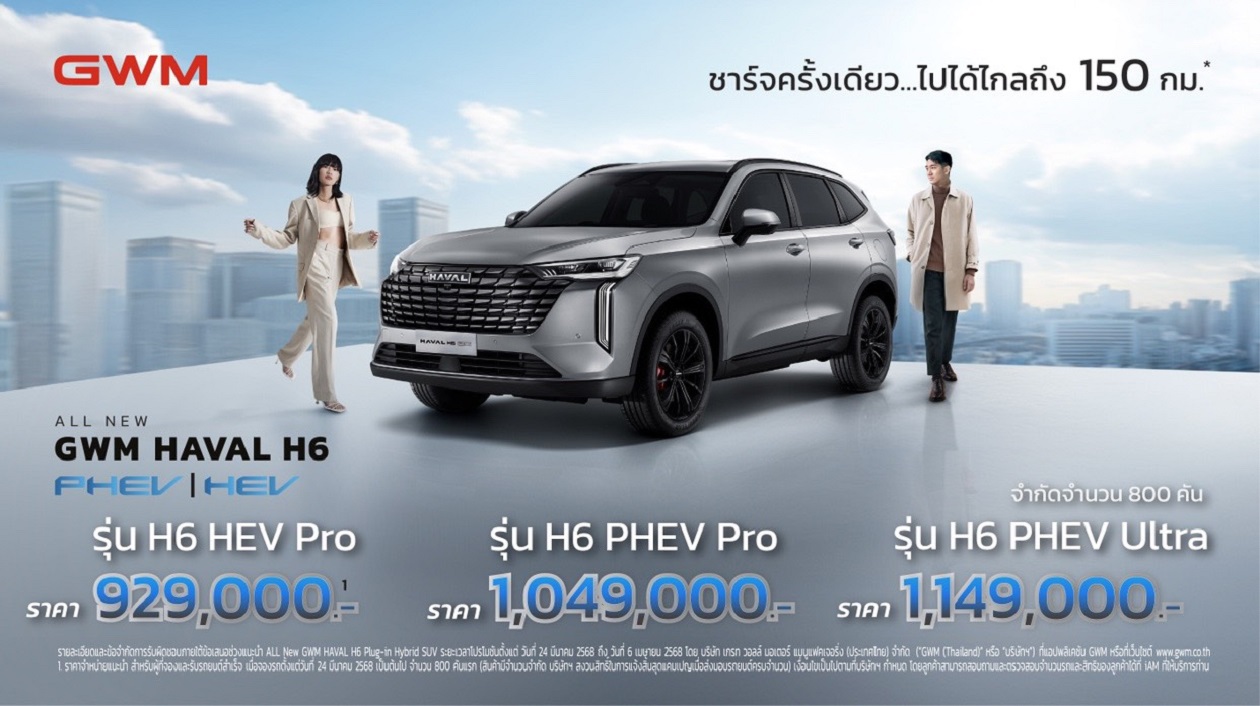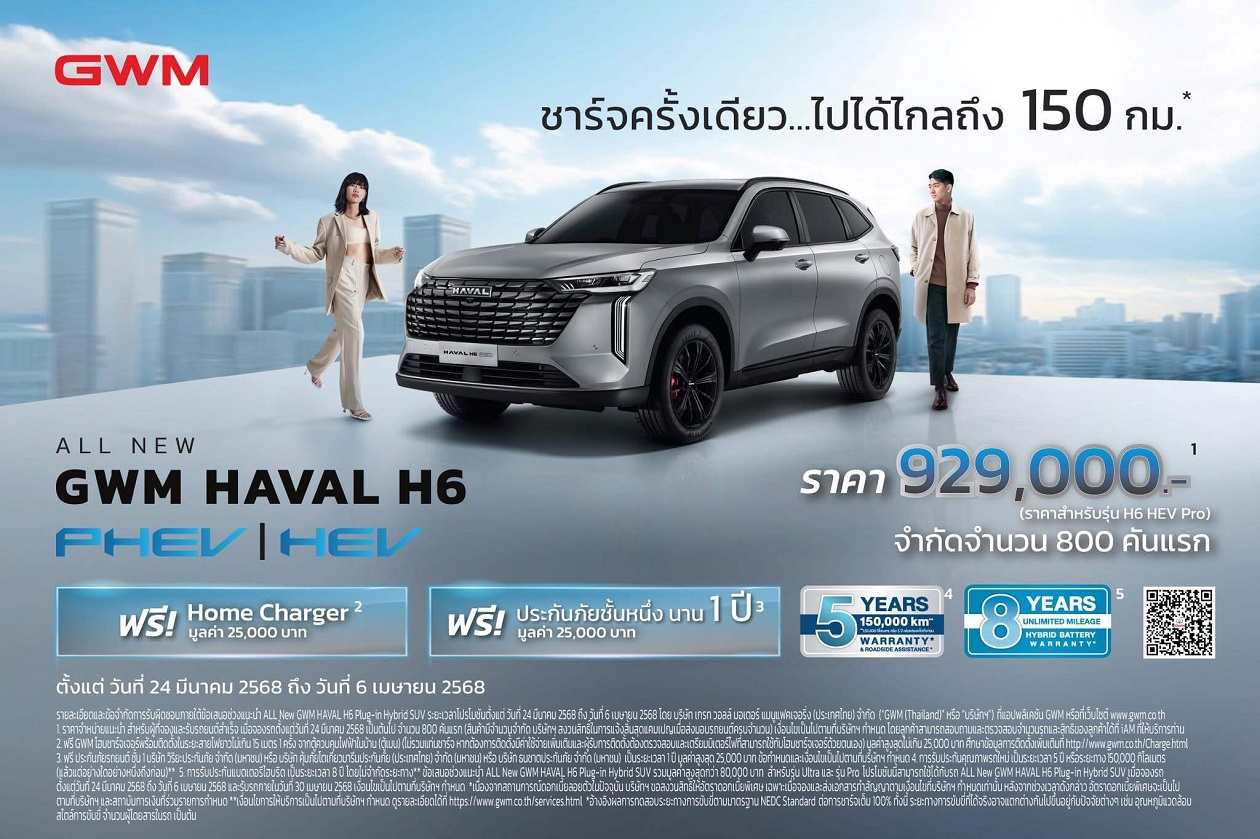 โดยราคาแนะนำในช่วงเปิดตัวสุดพิเศษนี้ มอบให้สำหรับลูกค้าที่จองและออกรถ 800 คันแรกเท่านั้น พิเศษยิ่งขึ้น สำหรับผู้ที่จอง ALL NEW GWM HAVAL H6 รับ ฟรี ประกันภัยชั้นหนึ่ง 1 ปีเต็ม ฟรี โฮมชาร์จเจอร์ (สำหรับรุ่นปลั๊กอิน-ไฮบริด) ฟรี บริการระบบตรวจสอบและสั่งการรถผ่านอินเทอร์เน็ต* (Telematic Service) พร้อมแพ็กเกจอินเทอร์เน็ตภายในรถ (Internet in Vehicle) ระยะเวลา 3 ปี ฟรี ค่าแรงบำรุงรักษาตามระยะทางภายในระยะเวลา 5 ปี หรือระยะทาง 100,000 กิโลเมตร (แล้วแต่อย่างใดอย่างหนึ่งถึงก่อน และไม่รวมอะไหล่สิ้นเปลือง) ฟรี บริการช่วยเหลือฉุกเฉิน (Roadside Assistance) ตลอด 24 ชั่วโมง เป็นระยะเวลา 5 ปี พร้อมการรับประกันคุณภาพแบตเตอรี่ไฮบริด ระยะเวลา 8 ปี ไม่จำกัดระยะทาง** การรับประกันคุณภาพแบตเตอรี่ปลั๊กอิน-ไฮบริด ระยะเวลา 8 ปี และหรือระยะทาง 180,000 กิโลเมตร** พร้อมการรับประกันคุณภาพรถใหม่ ครอบคลุมระยะเวลา 5 ปี หรือระยะทาง 150,000 กิโลเมตร** (แล้วแต่อย่างใดอย่างหนึ่งถึงก่อน)