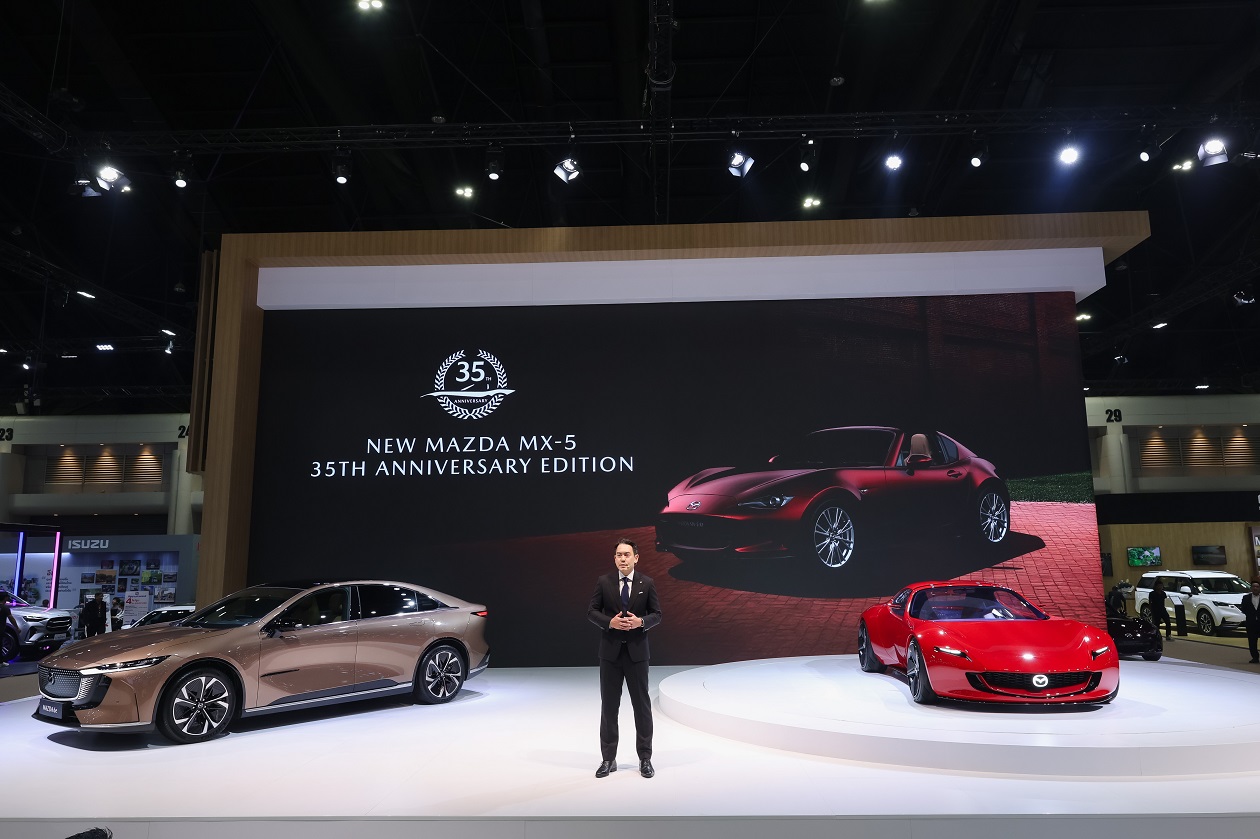 ไม่เพียงเท่านี้ มาสด้ายังได้นำยนตรกรรมรุ่นใหม่ล่าสุด แบรนด์ไอคอนยอดนิยม New Mazda MX-5 35th Anniversary Edition หรือ รุ่นพิเศษครบรอบ 35 ปี เปิดตัวเพื่อเป็นการร่วมเฉลิมฉลองการครบรอบ 35 ปี นับตั้งแต่ MX-5 ได้เปิดตัวเป็นครั้งแรก มาจัดแสดงให้แฟน ๆ ในประเทศไทยได้ชมและครอบครองเป็นเจ้าของ โดยมาพร้อมการตกแต่งพิเศษที่แตกต่างจากรุ่นทั่ว ๆ ไป เพื่อถ่ายทอดความพิเศษในทุกองค์ประกอบ ไม่ว่าจะเป็น สีภายนอกพิเศษ Artisan Red Premium สัญลักษณ์รุ่นพิเศษ 35th Anniversary Edition พนักพิงศีรษะ และพรม พร้อม Serial Number ที่บริเวณด้านข้างตัวถัง เพื่อบ่งบอกถึงบอกถึงความพิเศษในฐานะรุ่นลิมิเต็ด รวมถึงเบาะหนังสีพิเศษ Sports Tan หลังคาแข็งเปิด-ปิดด้วยระบบไฟฟ้า กระจกมองข้างสีเดียวกับตัวรถ พร้อมล้ออัลลอยขนาด 17 นิ้ว สี Bright ถ่ายทอดภาพลักษณ์สปอร์ตพรีเมี่ยมและความพิเศษได้อย่างมีเอกลักษณ์ วางจำหน่ายในจำนวนจำกัด ในราคา 3,069,000 บาท