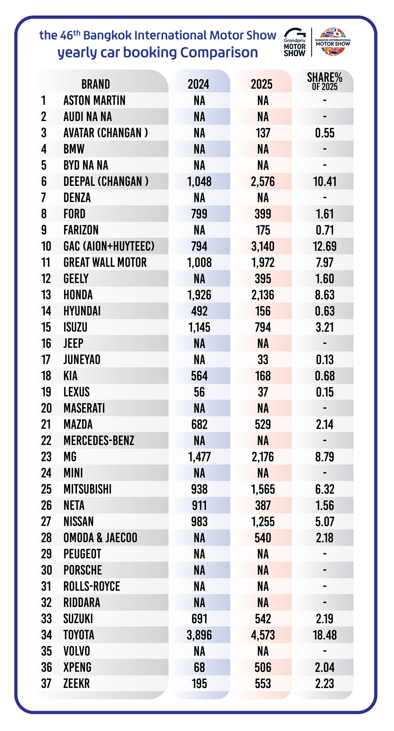 ทั้งนี้ ตัวเลขยอดจองรถยนต์ภายในงานเพิ่มขึ้นจากเป้าหมายที่ทางคณะผู้จัดงานฯ คาดการณ์ไว้ ส่วนหนึ่งเพราะในงานบางกอก มอเตอร์โชว์ปีนี้ มีผู้จำหน่ายรถยนต์ xEV เข้ามาร่วมงานหลายแบรนด์ และยังมีการเปิดตัวรถรุ่นใหม่อีกหลายรุ่น แต่คงต้องรอดูตัวเลขยอดจองหลังจบงานอีกครั้งในสัปดาห์หน้า ว่าจะมีอัตราการเติบโตเพิ่มขึ้นจากปีที่ผ่านมามากน้อยเพียงใด