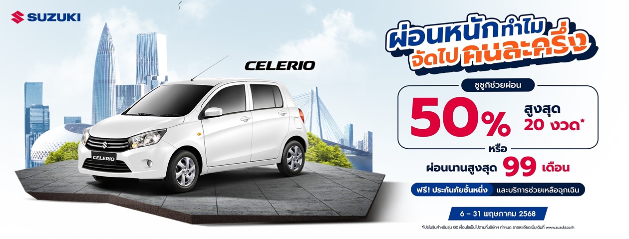 ซูซูกิเล็งเห็นถึงความต้องการของผู้บริโภคที่กำลังมองหารถยนต์คุณภาพดีที่สามารถเป็นเจ้าของได้ง่าย คุ้มค่า ประหยัดพลังงาน และประหยัดค่าใช้จ่ายในการดูแลรักษา ภายใต้แนวคิด “SUZUKI Cause We Care – เหนือกว่าความใส่ใจ คือความเข้าใจทุกความต้องการ” ท่ามกลางภาวะเศรษฐกิจที่ยังเปราะบาง แต่การมีรถยนต์ยังคงเป็นสิ่งจำเป็น ทั้งในฐานะพาหนะเพื่อยกระดับคุณภาพชีวิต และเป็นเครื่องมือในการประกอบอาชีพ ซูซูกิจึงเตรียมสร้างปรากฏการณ์ครั้งใหม่ ด้วยการเปิดตัวแคมเปญสุดร้อนแรงแห่งปี “ผ่อนหนักทำไม จัดไปคนละครึ่ง” ซื้อ SUZUKI CELERIO ซูซูกิช่วยผ่อน 50% หรือเลือกผ่อนนานสูงสุด 99 เดือน เพื่อเปิดโอกาสให้ผู้บริโภคสามารถเป็นเจ้าของรถได้ง่ายขึ้น และใช้งานได้อย่างคุ้มค่าในทุกมิติของการใช้ชีวิต