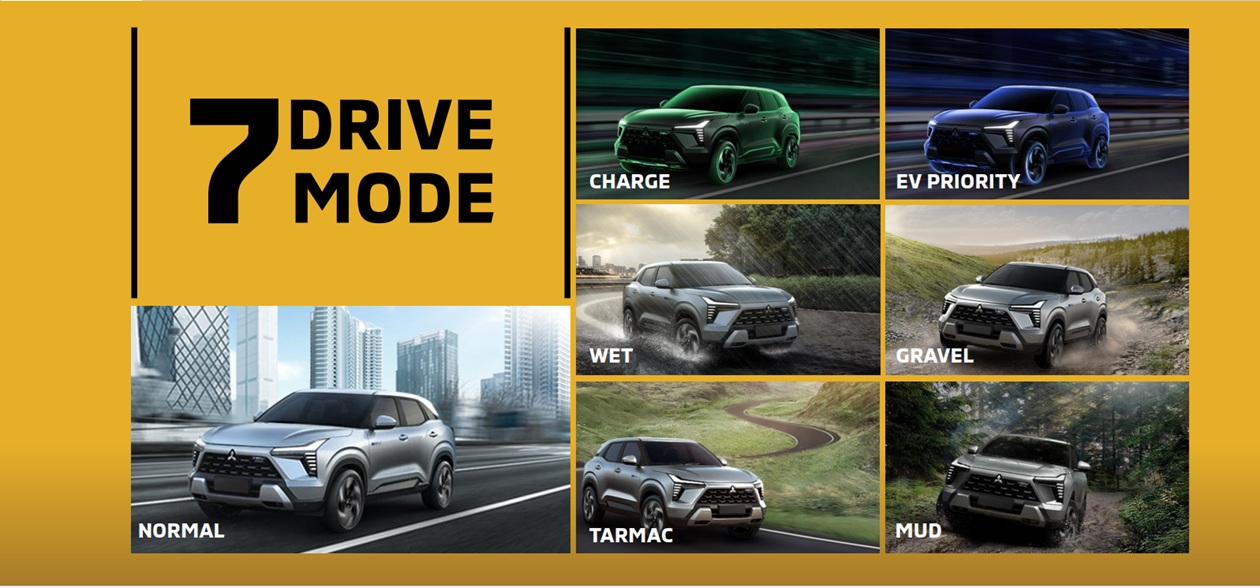 X Force HEV มาพร้อมกับโหมดการขับขี่ถึง 7 รูปแบบด้วยกัน ประกอบด้วย Normal Mode ใช้ขับขี่ประจำวัน, Wet Mode ใช้สำหรับการขับขี่บนถนนที่เปียกลื่น ป้องกันการลื่นไถล, Gravel Mode ใช้ขับขี่บนทางลูกรัง เพิ่มสมรรถนะในการขับขี่บนพื้นผิวที่ขุรขระ และลื่น, Tarmac Mode ไว้สำหรับขับขี่บนทางลาดยาง ปลดปล่อยสมรรถนะของเครื่องยนต์ และมอเตอร์ไฟฟ้าอย่างเต็มที่, Mud Mode เหมาะสำหรับการขับขี่ในเส้นทางที่เป็นโคลน เพิ่มการตอบสนอง การยึดเกาะ และการควบคุมที่ดีเยี่ยมบนถนนดินโคลน, EV Mode โหมดการขับขี่ด้วยไฟฟ้า 100% และ EV Change โหมดชาร์จไฟกลับเข้าสู่แบตเตอรี่
