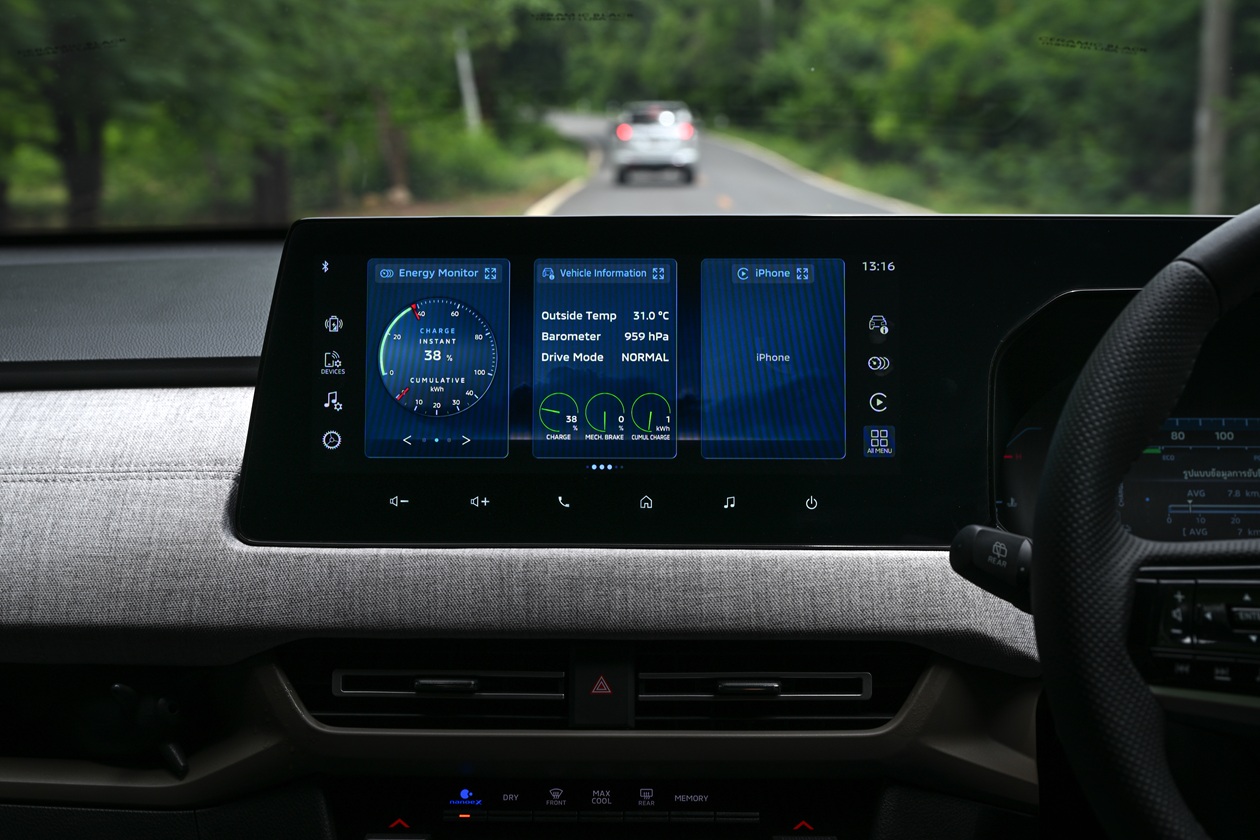 เราลองปรับโหมดการขับขี่เป็น Normal Mode พอเข้าช่วงเดินทางไกล พละกำลังของตัวมอเตอร์ก็ให้กำลังในการขับขี่ที่ดี อัตราเร่งในช่วงต่างๆ ทำได้ดีเยี่ยม และช่วงที่ต้องเร่งแซงในช่วงความเร็วระดับ 120 กม./ชม. เครื่องยนต์จะเข้ามาผสานกำลังกับตัวมอเตอร์ทำให้อัตราเร่งแซงทำได้ดีพอตัว และการทำงานของเครื่องยนต์ก็ไม่ได้ใช้รอบเครื่องยนต์ที่สูงมากนัก(หากเทียบกับ Nissan Kicks และ Toyota Yaris Cross)