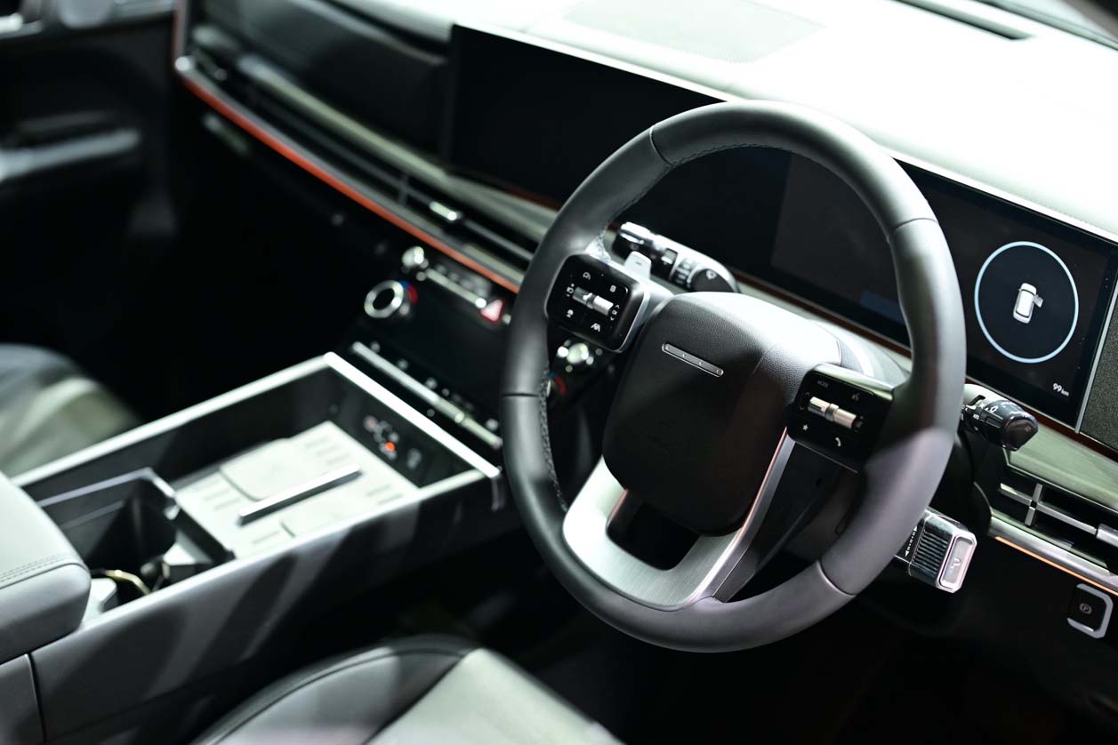 ภายในห้องโดยสารออกแบบเน้นความเรียบหรูให้สอดคล้องกับดีไซน์ของภายนอกตัวรถที่เน้นความแข็งแรง บึกบึน วัสดุตกแต่งภายในเลือกใช้แบบหนังกลับ Suede คอนโซนหน้าเหลี่ยมๆ เน้นความเรียบง่าย ชุดเรือนไมล์แบบ LED(Full LED ขนาด 12.3 นิ้ว รุ่น Prestige) ปรับเปลี่ยนดิสเพลย์เพื่อให้ดูโหมดการใช้งานต่างๆ ได้อย่างสะดวก โดยกรอบของชุเรือนไมล์ออกแบบให้เป็นชิ้นเดียวกับ ชุดจอมัลติฟังด์ชั่นขนาด 12.3 นิ้ว แบบ ทัชสกรีน เชื่อมต่อ Apple Car Play/ Android Auto แบบไร้สาย Wireless ตัวจอสามารถแสดงฟังก์ชั่นการทำงานของตัวรถในเรื่องของการใช้พลังงานไฟฟ้าได้อย่างละเอียด ที่ชาร์จโทรศัพท์แบบไร้สาย Wireless Changer พร้อมช่องเชื่อมต่อ USB Type C ทางด้านหน้า และ USB Type C 6 ตำแหน่ง มีช่องชาร์จไฟ 12V 2 ตำแหน่งรบบสั่งงานด้วยเสียง ชุดเครื่องเสียงมาพร้อมกับลำโพง 6 ตำแหน่ง