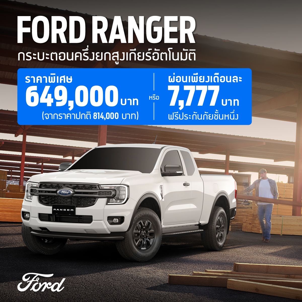 ฟอร์ด เรนเจอร์ XLS กระบะตอนครึ่งยกสูงใหม่ เกียร์อัตโนมัติ เครื่องยนต์ดีเซล 2.0 ลิตร เทอร์โบ มาในสองข้อเสนอสุดเร้าให้ลูกค้าเลือกได้ตามความต้องการ ได้แก่ ราคาพิเศษ 649,000 บาท จากราคาปกติ 814,000 บาท เมื่อจัดไฟแนนซ์ผ่านฟอร์ด ลีสซิ่ง (ไม่รวมประกันภัย) หรือเลือกผ่อนชำระต่ำเพียง 7,777 บาท นานถึง 84 เดือน เมื่อดาวน์ 30% จากราคาปกติ 814,000 บาท ดอกเบี้ย 2.09% ฟรีประกันภัยชั้นหนึ่ง และฟอร์ด แคร์ หรือการรับประกันเครื่องยนต์และระบบส่งกำลังนาน 5 ปี หรือ 150,000 กิโลเมตร แล้วแต่ระยะใดถึงก่อน