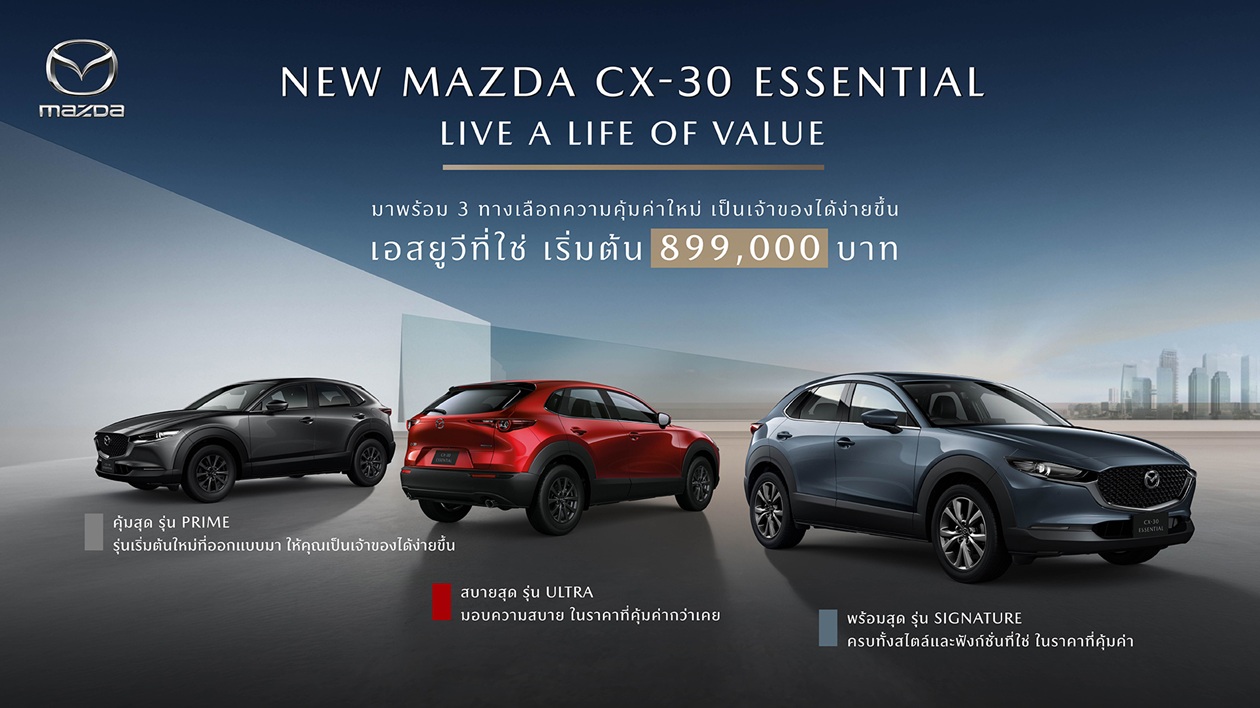 มาสด้าต้องการให้รถยนต์มาสด้าเข้ามาเติมเต็มวิถีการดำรงชีวิตของลูกค้า เข้ามาเป็นส่วนหนึ่งในการใช้ชีวิต เป็นเหมือนเพื่อนคู่ใจในการเดินทาง ก่อเกิดเป็นความผูกพันกับแบรนด์ในระยะยาว และหวังเป็นอย่างยิ่งว่าครอสโอเวอร์เอสยูวี New Mazda CX-30 Essential จะเป็นหนึ่งในทางเลือกที่ดีที่สุดสำหรับลูกค้าที่กำลังมองหารถอเนกประสงค์ที่ตอบโจทย์ทุกความต้องการด้วยไลฟ์สไตล์ที่หลากหลาย ด้วยองค์ประกอบที่ใส่มาครบครัน พร้อมส่งมอบความสนุกสนานในการขับขี่และดีไซน์ที่สง่างาม ที่สำคัญมีการปรับราคาใหม่ให้เข้าถึงได้ง่ายขึ้น ลูกค้าที่สนใจสามารถแวะชมและสัมผัสคันจริงได้ที่โชว์รูมมาสด้าทั่วประเทศ พร้อมรับข้อเสนอ ดอกเบี้ย 2.49%1 ฟรีประกันภัยชั้นหนึ่ง Mazda Premium Insurance 1 ปี2 พิเศษสุดสำหรับลูกค้า Mazda Family รับฟรีบัตรน้ำมัน มูลค่า 20,000 บาท หรือศึกษารายละเอียดเพิ่มเติมได้ที่เว็บไซต์ www.mazda.co.th