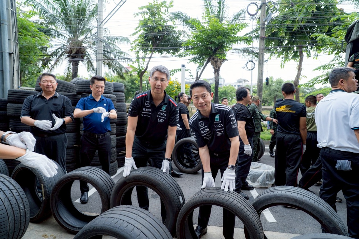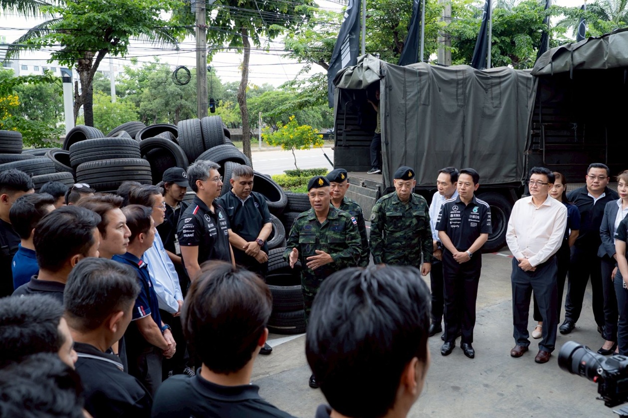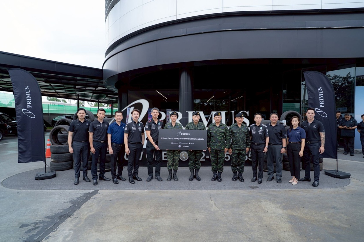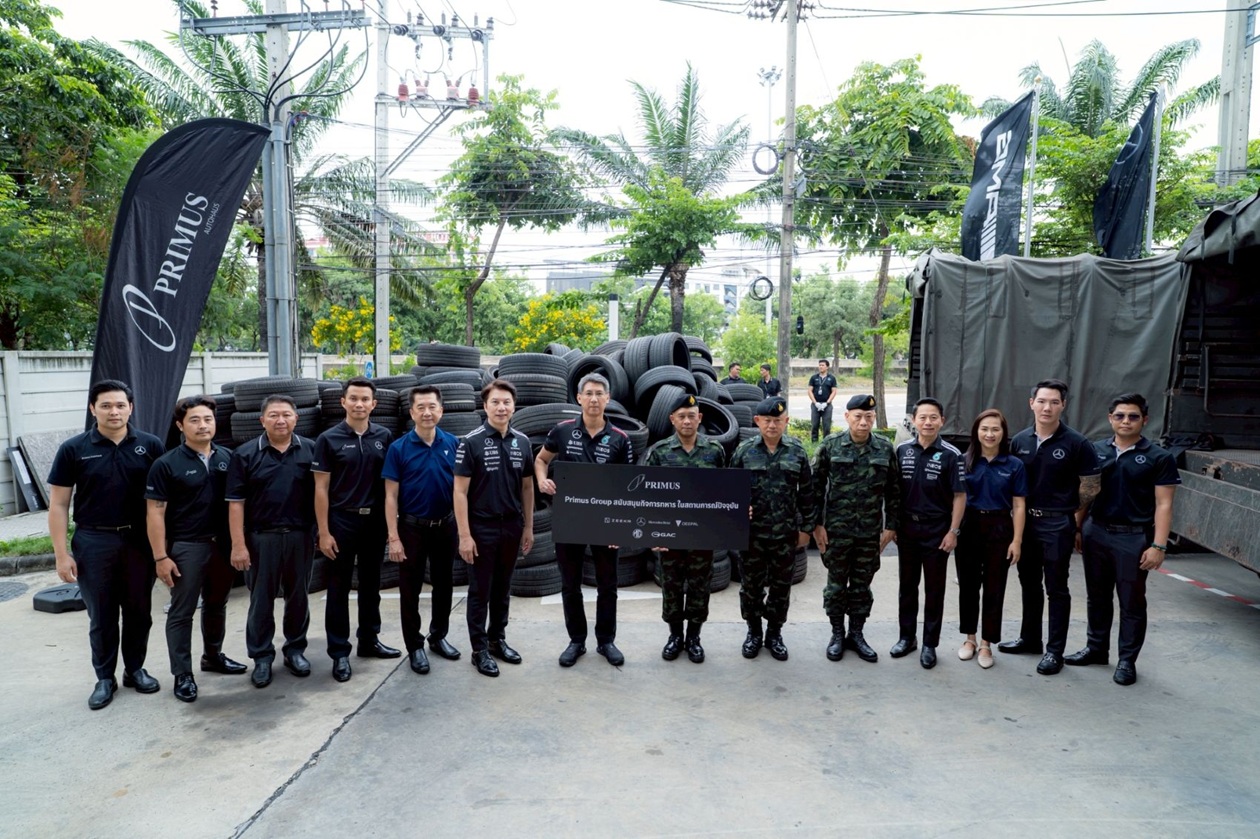 เมื่อเร็วๆ นี้ ณัฏฐวุฒิ ตั้งคารวคุณ (ที่ 5 จากซ้าย) ประธาน, จิระพล รุจิวิพัฒน์ (ที่ 4 จากขวา) กรรมการผู้จัดการ, ศราวิช ไชยมังกร (ที่ 4 จากซ้าย) รองกรรมการผู้จัดการ และคณะผู้บริหาร บริษัทในเครือ ไพรม์มัส กรุ๊ป ร่วมมอบยางรถยนต์ ที่ได้จากการรวบรวมยางรถยนต์ใช้แล้วของลูกค้าที่เข้าใช้บริการหลังการขายของศูนย์บริการรถยนต์ ไพรม์มัส กรุ๊ป ทั้ง 5 ยี่ห้อ ได้แก่ Mercedes-Benz, Zeekr, Deepal, MG และ Aion รวมจำนวนทั้งสิ้น 524 เส้น ให้แก่กองทัพบก เพื่อนำไปสนับสนุนการปฏิบัติงานในกิจการของกองทัพ โดยมี พล.ต.วีรธัช ศรีใส (ที่ 5 จากขวา) ผู้อำนวยการ สำนักส่งกำลังบำรุง กรมส่งกำลังบำรุงทหารบก ในนามผู้แทน เจ้ากรมส่งกำลังบำรุงทหารบก ในกองบัญชาการกองทัพบก พร้อม พ.อ.ธนิต อิ่มอกใจ (ที่ 6 จากขวา) เสนาธิการ ศูนย์การเคลื่อนย้ายกองทัพบก และ พ.อ.อัครนิธิ์ ณ เชียงใหม่ (ที่ 7 จากขวา) นายทหาร ฝ่ายยุทธการ กรมขนส่งทหารบก เป็นผู้รับมอบ พร้อมร่วมส่งกำลังใจให้แก่ทหารแนวหน้าทุกท่าน ที่ทำหน้าที่ปกป้องอธิปไตยของไทย ณ บริเวณโชว์รูมและศูนย์บริการรถยนต์ของ “ไพรม์มัส กรุ๊ป”