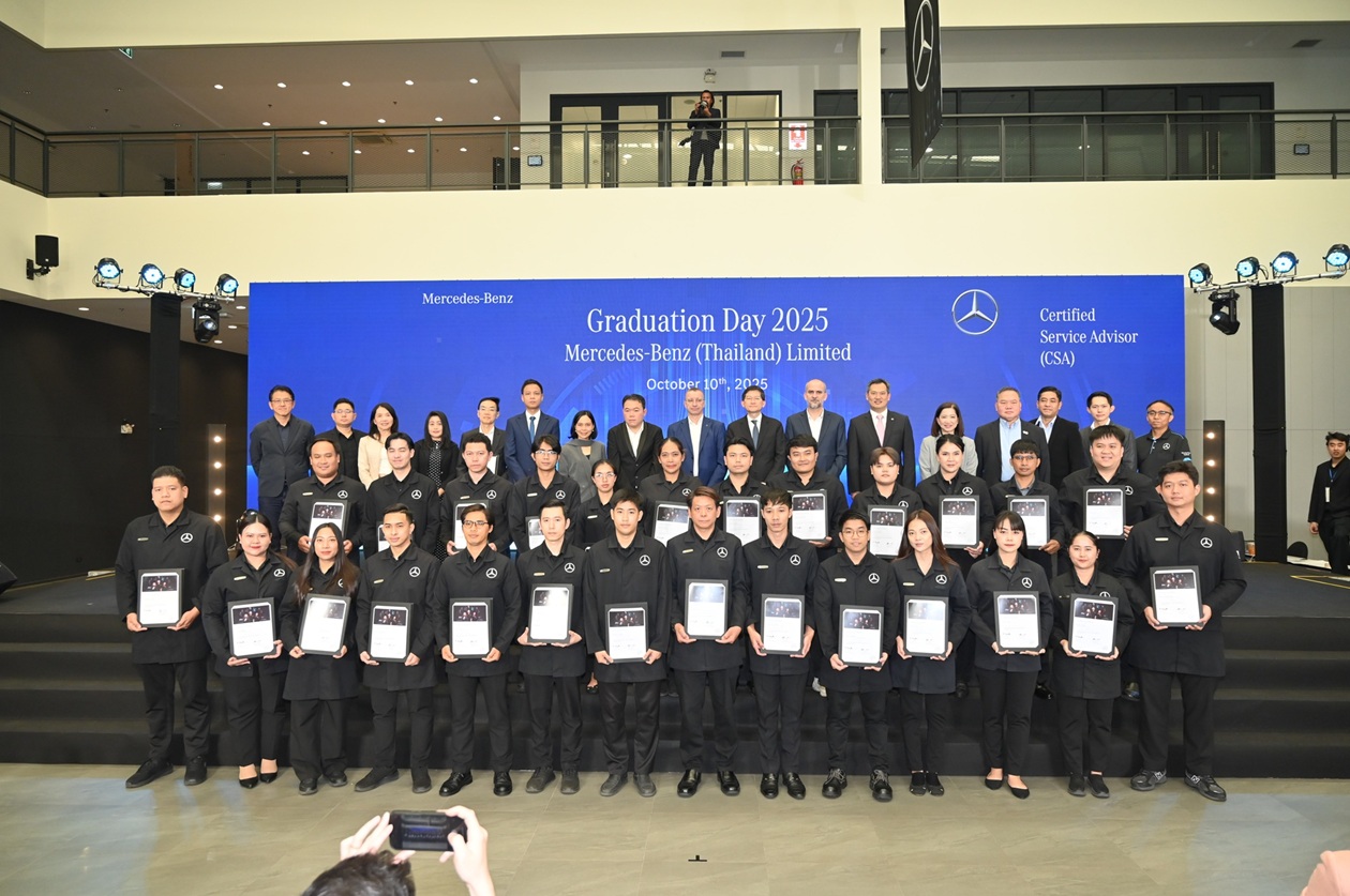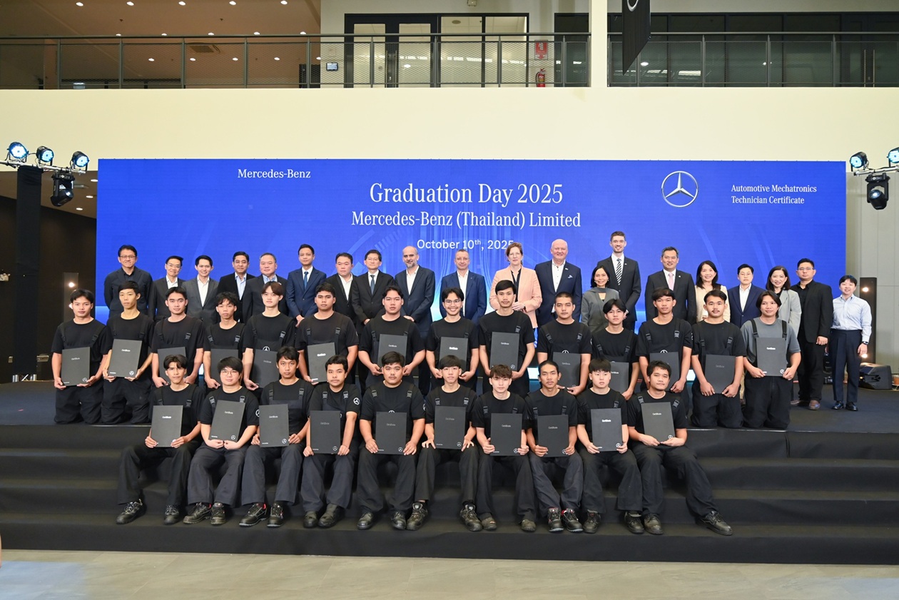 เมื่อวันที่ 10 ตุลาคม 2568 ที่ผ่านมา บริษัท เมอร์เซเดส-เบนซ์ (ประเทศไทย) จำกัด จัดงานวันสำเร็จการศึกษาและมอบประกาศนียบัตรให้แก่นักศึกษาช่างฝึกหัดจำนวน 25 คน ที่สำเร็จการศึกษาโครงการฝึกงานนักเรียนช่างฝึกหัดแบบทวิภาคี ในสาขาวิชาช่างเทคนิคยานยนต์เมคคาทรอนิกส์ของเมอร์เซเดส-เบนซ์ รุ่นที่ 34 และ 35 โดยโครงการฝึกงานระยะเวลา 2 ปีนี้ได้รับการรับรองจากหอการค้าและอุตสาหกรรมเยอรมัน (DIHK) ตามมาตรฐานการศึกษาทวิภาคีเยอรมัน-ไทย (GTDEE) ในสาขาเมคคาทรอนิกส์ยานยนต์