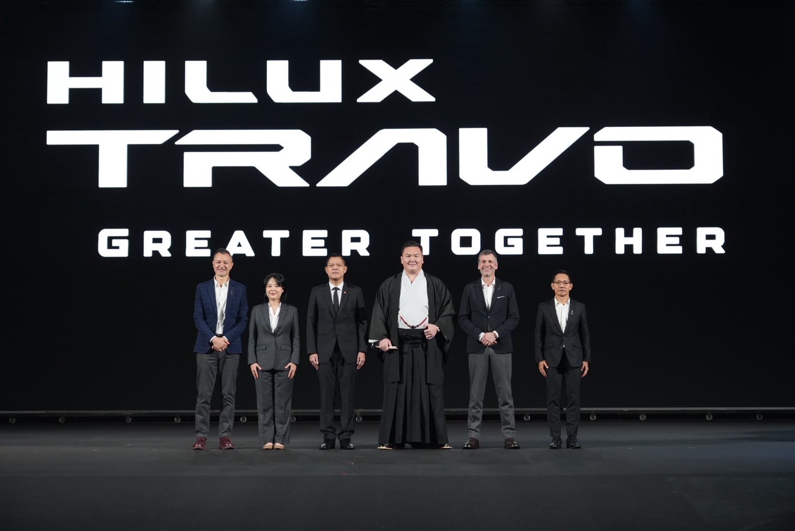 มร.ไซม่อน ฮัมฟรีส์ ประธานเจ้าหน้าที่บริหารด้านแบรนด์ บริษัท โตโยต้า มอเตอร์ คอร์ปอเรชัน ประเทศญี่ปุ่น / มร.นิค โฮจิออส ผู้จัดการอาวุโส โตโยต้าดีไซน์ ประเทศออสเตรเลีย / ดร.ธนกร วังบุญคงชนะ รัฐมนตรีว่าการกระทรวงอุตสาหกรรม / ดร.ณัฐพล รังสิตพล ปลัดกระทรวงอุตสาหกรรม / นายฐาปกรณ์ กุลเจริญ เลขานุการรัฐมนตรีว่าการกระทรวงอุตสาหกรรม / นางสาวจิรัฐิติกาล จันทราทิพย์ ประจำสำนักเลขาธิการนายกรัฐมนตรี / นายกลินท์ สารสิน ประธานคณะกรรมการ และ มร.โนริอากิ ยามาชิตะ กรรมการผู้จัดการใหญ่ พร้อมกับ นายศุภกร รัตนวราหะ รองกรรมการผู้จัดการใหญ่ บริษัท โตโยต้า มอเตอร์ ประเทศไทย จำกัด พร้อมด้วย นางสาวอัญญารัตน์ สุทธิเบญจกุล หัวหน้าวิศวกรระดับภูมิภาค บริษัท โตโยต้า มอเตอร์ เอเชีย (ประเทศไทย) จำกัด และ มร.ฮาคุโฮ โช เจ้าของแชมป์กีฬาซูโม่ระดับโยโกสุนะ (Yokozuna) ชื่อดัง ลำดับที่ 69 จากประเทศญี่ปุ่น ร่วมแถลงข่าวเปิดตัวรถกระบะมหาชนรุ่นใหม่ล่าสุด เป็นครั้งแรกของโลกที่ประเทศไทยกับ TOYOTA HILUX TRAVO และ HILUX TRAVO-e เมื่อวันที่ 10 พฤศจิกายน 2568 ณ ศูนย์นิทรรศการและการประชุมไบเทค