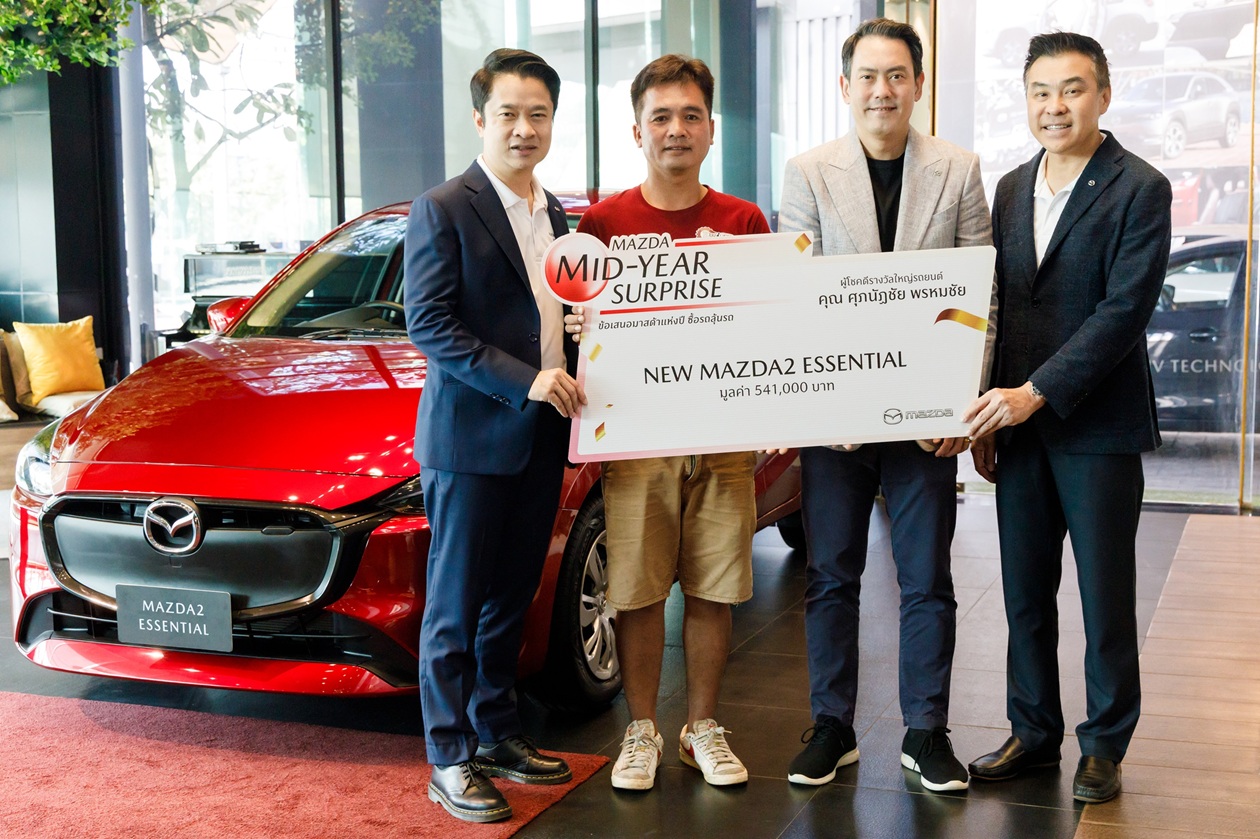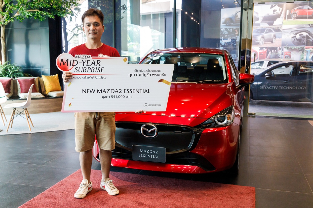สำหรับแคมเปญ MAZDA MID-YEAR SURPRISE ข้อเสนอมาสด้าแห่งปี ซื้อรถลุ้นรถ เป็นแคมเปญที่มาสด้าจัดขึ้นเพื่อลูกค้าที่ซื้อรถยนต์มาสด้าคันใหม่ในระหว่างเดือนสิงหาคมและกันยายน 2568 ได้มีโอกาสลุ้นรับโชคถึง 2 ต่อ รวมมูลค่ากว่า 1.8 ล้านบาท ทั้งรางวัลประจำเดือน 260 รางวัล ประกอบด้วย Apple iPhone 16e 128GB มูลค่า 20,000 บาท* จำนวน 20 รางวัล, Apple iPad A16 11-inch Wi-Fi 128GB มูลค่า 11,100 บาท* จำนวน 40 รางวัล, เครื่องฟอกอากาศในรถยนต์ SHARP รุ่น IG-NX2B มูลค่า 2,247 บาท* จำนวน 200 รางวัล และรางวัลใหญ่ รถยนต์ New Mazda2 Essential รุ่น 1.3 Prime มูลค่า 541,000 บาท อีก 1 รางวัล ทั้งนี้ มาสด้าได้ประกาศรายชื่อผู้โชคดีและมอบรางวัลให้กับลูกค้าทั้งหมดเป็นที่เรียบร้อยแล้ว