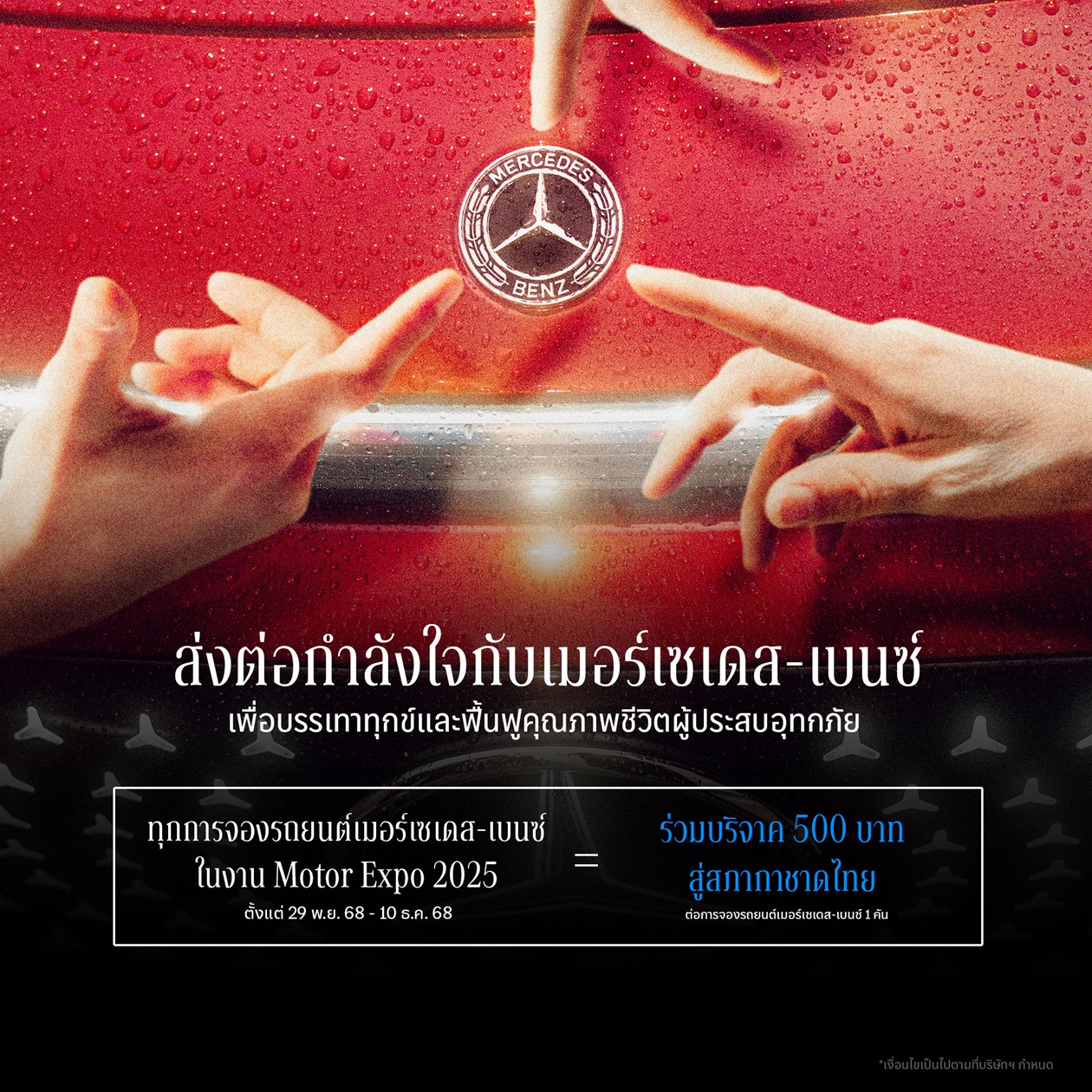 เมอร์เซเดส-เบนซ์ ประเทศไทย ส่งต่อกำลังใจให้ชาวไทยทุกคนในช่วงเวลาแห่งการบรรเทาทุกข์และฟื้นฟูคุณภาพชีวิตสำหรับผู้ที่ประสบอุทกภัยในทุกพื้นที่ ประกาศร่วมบริจาคให้กับสภากาชาดไทยจำนวน 500 บาท ต่อ 1 ใบจองในงาน Motor Expo 2025 ตั้งแต่วันที่ 29 พฤศจิกายน – 10 ธันวาคม 2568 ซึ่งยอดเงินบริจาคทั้งหมดจะถูกคำนวนตามยอดจองที่เกิดขึ้นจริงในงาน โดยทีมผู้บริหารเมอร์เซเดส-เบนซ์ ประเทศไทย จะร่วมส่งมอบเงินบริจาคทั้งหมด ในวันที่ 17 ธันวาคม 2568