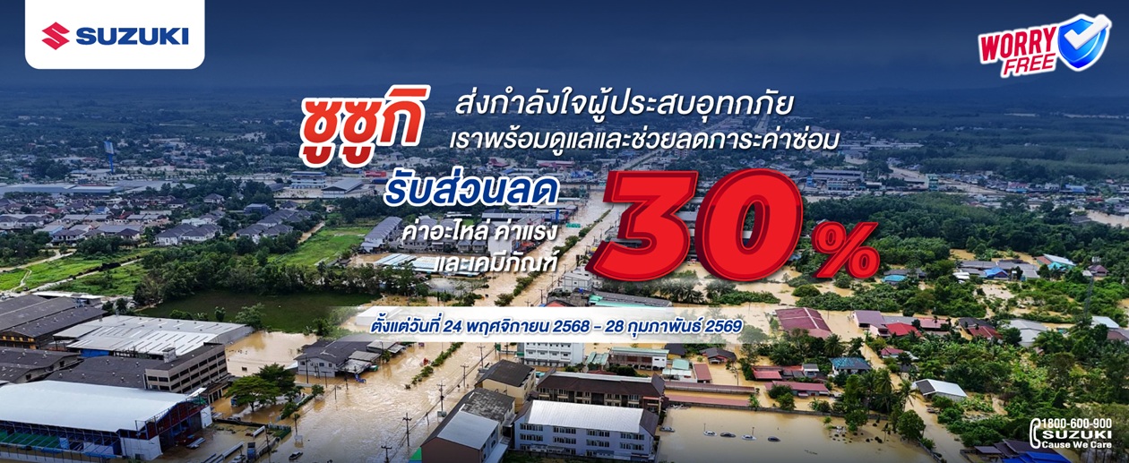 4 ธันวาคม 2568-กรุงเทพมหานคร-บริษัท ซูซูกิ มอเตอร์ (ประเทศไทย) จำกัด เปิดเผยว่า จากสถานการณ์หลายพื้นที่ในภาคใต้ที่ได้รับความเดือดร้อนจากเหตุอุทกภัยครั้งร้ายแรง โดยเฉพาะในอำเภอหาดใหญ่ จังหวัดสงขลา และ พื้นที่หลายอำเภอในจังหวัดสตูล ซูซูกิจึงมีนโยบายเร่งด่วน ภายใต้โครงการ “ซูซูกิร่วมใจ ห่วงใยผู้ประสบภัยน้ำท่วม” โดยร่วมมือกับผู้จำหน่ายรถยนต์ซูซูกิในพื้นที่ประสบภัย 9 จังหวัด ภาคใต้ มอบส่วนลดพิเศษสูงสุด 30% ในการนำรถเข้าซ่อมแซมและฟื้นฟูสภาพรถยนต์ที่ศูนย์บริการมาตรฐานซูซูกิ เพื่อเป็นการช่วยแบ่งเบาภาระและบรรเทาความเดือดร้อนให้กับผู้ใช้รถยนต์ซูซูกิทุกท่านให้สามารถกลับมาใช้ชีวิตประจำวันได้อย่างรวดเร็ว