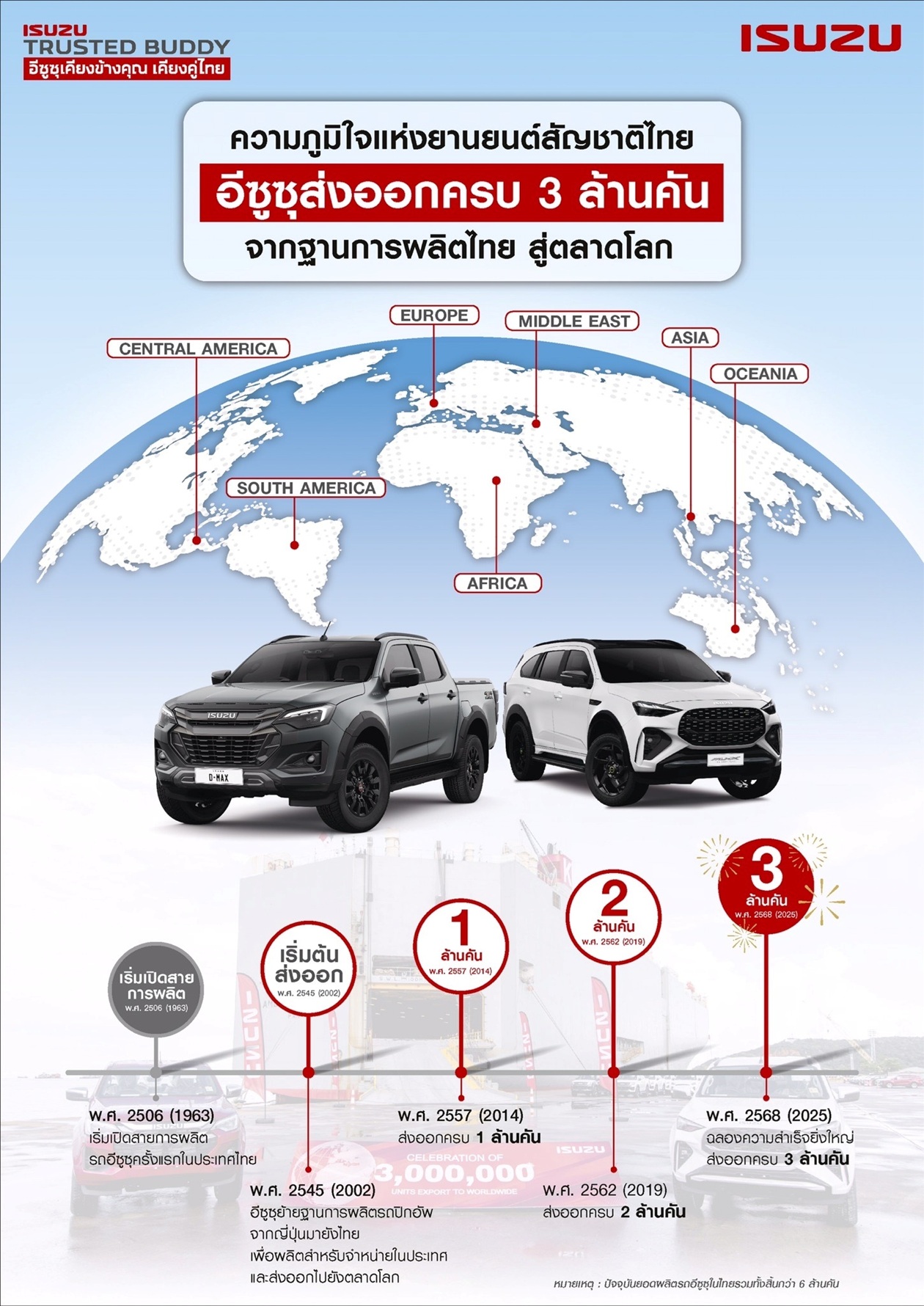 อีซูซุประกาศความสำเร็จครั้งประวัติศาสตร์ส่งท้ายปีด้วยยอดการส่งออกรถอีซูซุทั้งรถปิกอัพ “อีซูซุ ดีแมคซ์” และ รถยนต์นั่งอเนกประสงค์ “มิว-เอ็กซ์” จากฐานการผลิตในประเทศไทยไปสู่ตลาดโลก ครบ 3,000,000 คัน อย่างเป็นทางการ นับเป็นการยืนยันถึงคุณภาพมาตรฐานระดับโลก ตอกย้ำศักดิ์ศรีการเป็น “โปรดักแชมเปี้ยน” ที่สร้างมูลค่าทางเศรษฐกิจและภาพลักษณ์อันแข็งแกร่งให้ประเทศไทยในตลาดโลก สะท้อนความเชื่อมั่นที่ลูกค้าทั่วโลกมีต่อผลิตภัณฑ์อีซูซุที่ผลิตจากฐานการผลิตในไทย