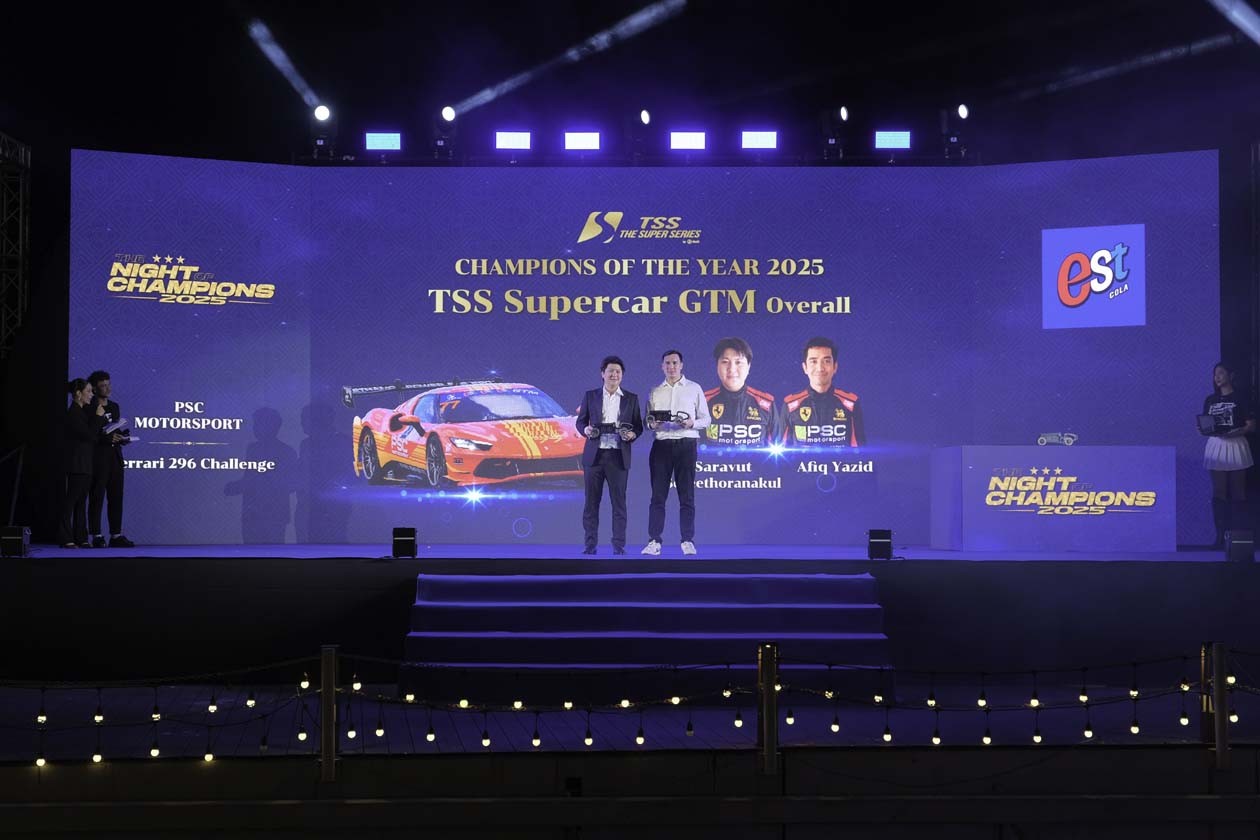สำหรับการแข่งขันในรุ่น TSS Supercar GTM - Overall แชมป์ประจำปี 2025 ได้แก่ คุณสราวุธ เสรีธรณกุล และ Mr. Afiq Yazid สังกัด PSC MOTORSPORT โดยมี คุณณัฐวุฒิ เจริญสุขะวัฒนะ
