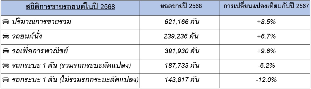 ภาพรวมของอุตสาหกรรมยานยนต์ไทยในปี 2568 ยังคงเผชิญกับสถานการณ์ที่ท้าทายจากสภาวะโดยรวมของเศรษฐกิจในประเทศและทิศทางของตลาดในปีที่ผ่านมา สะท้อนมายังตลาดรถยนต์ในประเทศที่ยังคงอยู่ในช่วงฟื้นตัวอย่างค่อยเป็นค่อยไป โดยมีตัวเลขยอดขายรวมในปี 2568 อยู่ที่ 621,166 คัน หรือเพิ่มขึ้น 8.5% เมื่อเทียบกับ ปี 2567