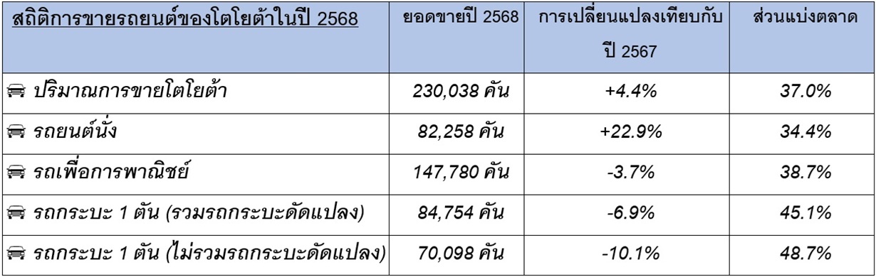 สำหรับยอดขายของโตโยต้าในปี 2568 มียอดขายโดยรวมอยู่ที่ 230,038 คัน หรือเพิ่มขึ้น 4.4% เมื่อเทียบกับปีที่ผ่านมา โดยยังคงความเป็นผู้นำตลาดด้วยส่วนแบ่งทางการตลาดเป็นอันดับ 1 หรือเท่ากับ 37.0% ของยอดขายรถยนต์ทั้งหมด และสามารถครองความเป็นอันดับ 1 ได้ทั้ง 7 ตลาดหลัก โดยเฉพาะในตลาดรถยนต์นั่ง โตโยต้ายังคงสามารถครองส่วนแบ่งทางการตลาดเป็นอันดับ 1 ที่ 34.4% จากความนิยมของรถยนต์ในกลุ่มอีโคคาร์ (ECO Car) ที่สามารถครองส่วนแบ่งการตลาดได้ถึง 48.7% และในกลุ่มรถยนต์ไฮบริด (HEV) ของโตโยต้าที่ยังคงได้รับความเชื่อมั่นและไว้วางใจในคุณภาพ สามารถครองส่วนแบ่งการตลาดได้สูงถึง 47.4% จากตลาดรถเครื่องยนต์ไฮบริดทั้งหมด