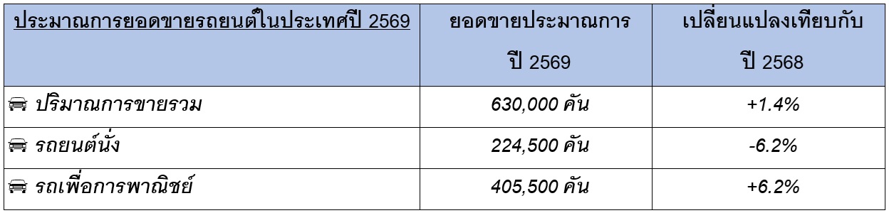 อย่างไรก็ดี เชื่อว่ายังพอมีแรงหนุนด้านอุปสงค์จากกิจกรรมในภาคธุรกิจและการลงทุน นโยบายของภาครัฐที่จะสนับสนุนการใช้จ่ายให้เร่งตัวขึ้น การขยายตัวของการลงทุนที่เกี่ยวข้องกับกิจกรรมภายในประเทศและโครงสร้างพื้นฐาน รวมถึงการผลักดันมาตรการสนับสนุนของภาครัฐที่มีต่ออุตสาหกรรมยานยนต์ในประเทศ ตลอดจนการแนะนำรถยนต์รุ่นใหม่ๆ ที่มาพร้อมกับกลยุทธการส่งเสริมการขายจากผู้ผลิตรถยนต์แบรนด์ต่างๆ ทำให้คาดการณ์ว่ายอดขายรถยนต์ในปี 2569 จะอยู่ที่ 630,000 คัน หรือเพิ่มขึ้น 1.4% เมื่อเทียบกับปีที่แล้ว