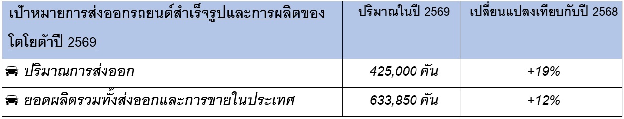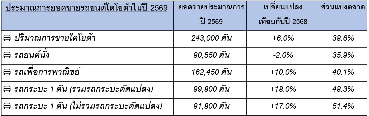 บริษัท โตโยต้า มอเตอร์ ประเทศไทย จำกัด แถลงสถิติการจำหน่ายรถยนต์ปี 2568 พร้อมคาดการณ์ตลาดรถยนต์ไทยปี 2569 เมื่อวันที่ 30 มกราคม 2569 ![]()