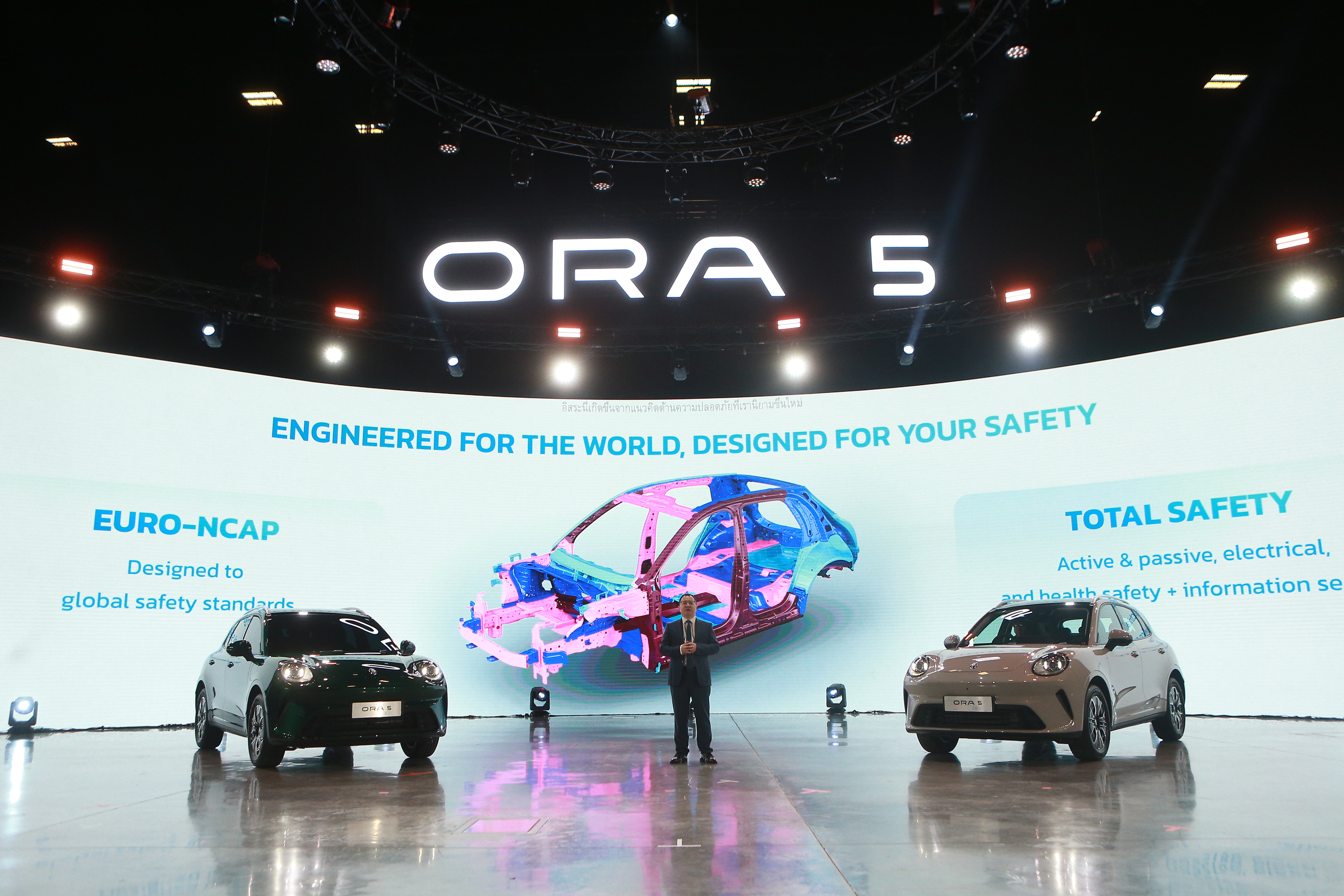 ด้านความปลอดภัย GWM ORA 5 ได้รับการพัฒนาเพื่อมอบความมั่นใจสูงสุดให้กับผู้ขับขี่และผู้โดยสาร ด้วยระบบความปลอดภัยพื้นฐานครบครัน อาทิ ระบบติดต่อฉุกเฉิน E-Call ถุงลมนิรภัยคู่หน้า ด้านข้าง และม่านถุงลม เข็มขัดนิรภัยพร้อมระบบเตือนการคาดเข็มขัดนิรภัย ระบบเบรกป้องกันล้อล็อก (ABS) ระบบกระจายแรงเบรกอิเล็กทรอนิกส์ (EBD) ระบบควบคุมการลื่นไถล (TCS) รวมถึงระบบช่วยควบคุมรถบนทางลาดชัน HSA/HDC และจุดยึดเบาะนั่งสำหรับเด็กแบบ ISOFIX นอกจากนี้ยังติดตั้งฟังก์ชันความปลอดภัยที่ช่วยเพิ่มความสะดวกในการใช้งาน เช่น ระบบล็อกประตูอัตโนมัติ สัญญาณเตือนกะระยะ 4 จุด ระบบตรวจจับแรงดันลมยาง (TPMS) และชุดปะยางฉุกเฉิน เพื่อเสริมความอุ่นใจในทุกการเดินทาง เพื่อยกระดับความปลอดภัยให้ก้าวล้ำยิ่งขึ้น GWM ORA 5 ยังติดตั้งเทคโนโลยีช่วยขับขี่อัจฉริยะ ADAS มากถึง 18 ระบบ ที่ทำงานร่วมกับกล้องมองภาพรอบคัน 360 องศา พร้อมระบบแสดงภาพใต้ท้องรถแบบโปร่งใส (Body Transparent) ช่วยให้ผู้ขับขี่สามารถมองเห็นสภาพแวดล้อมรอบตัวรถได้อย่างชัดเจน ลดความเสี่ยงจากจุดอับสายตา และเพิ่มความมั่นใจในการขับขี่ในทุกสถานการณ์ ไม่ว่าจะเป็นการจอดรถ การขับผ่านพื้นที่แคบ หรือการเดินทางในสภาพการจราจรที่ซับซ้อน