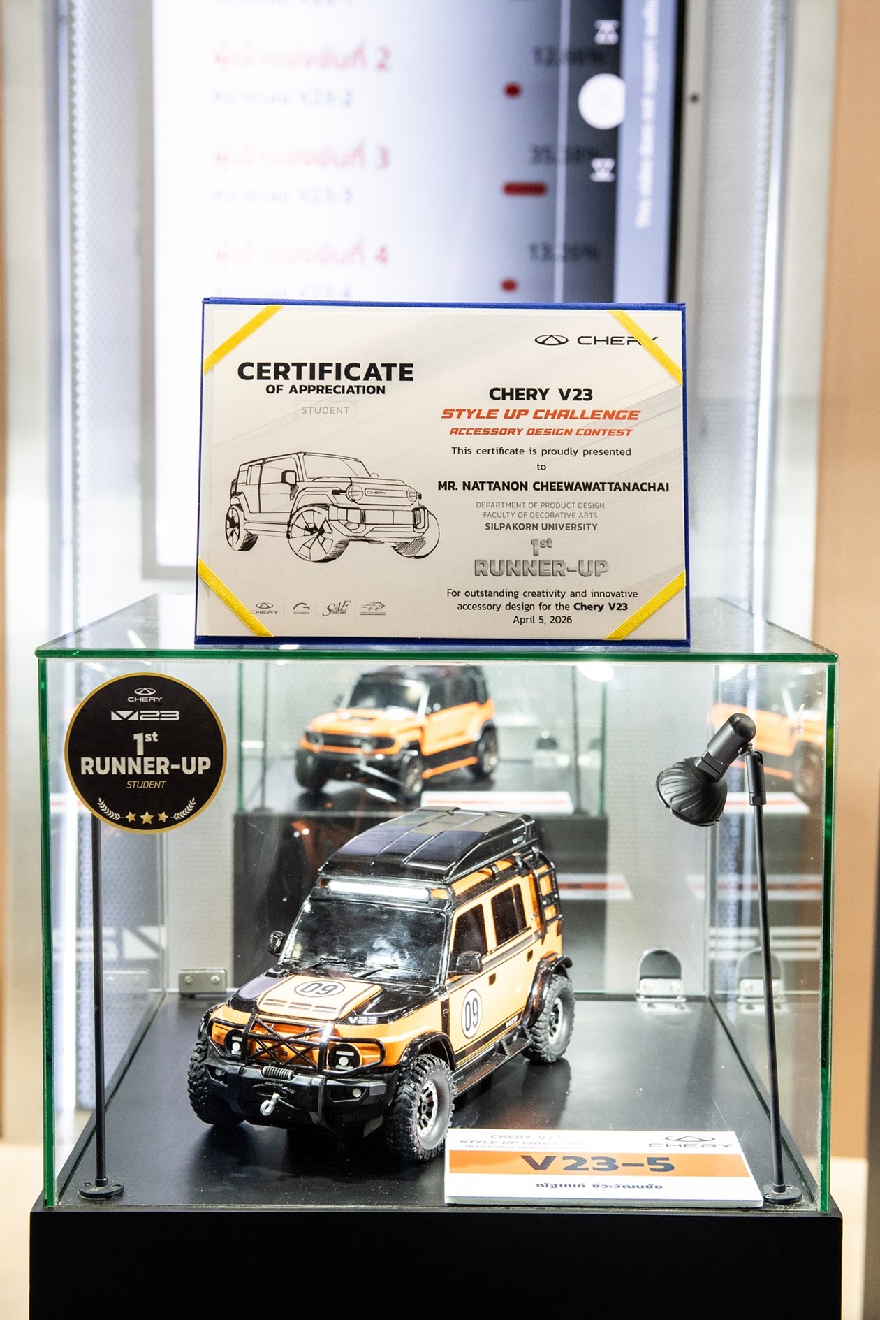 ทั้งนี้ โครงการ “Chery V23 Style Up Challenge” สะท้อนทิศทางของเชอรีที่เติบโตไปพร้อมกับความคิดสร้างสรรค์ของนักออกแบบไทย ดึงแรงบันดาลใจไปสร้างสรรค์เป็นการออกแบบ พร้อมเปลี่ยนไอเดียสู่การผลิตจริง ถือเป็นอีกหนึ่งเวทีสำคัญในการส่งเสริมศักยภาพด้านการออกแบบยานยนต์ของคนรุ่นใหม่ พร้อมต่อยอดสู่เวทีระดับสากล และสะท้อนถึงความมุ่งมั่นในการพัฒนาอุตสาหกรรมยานยนต์ไทยอย่างยั่งยืน