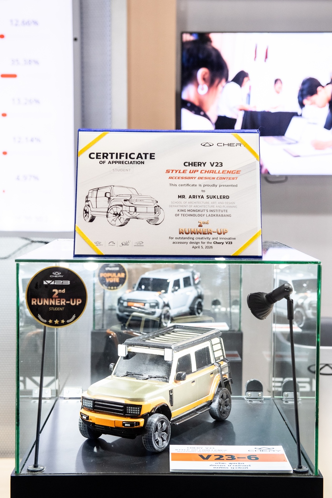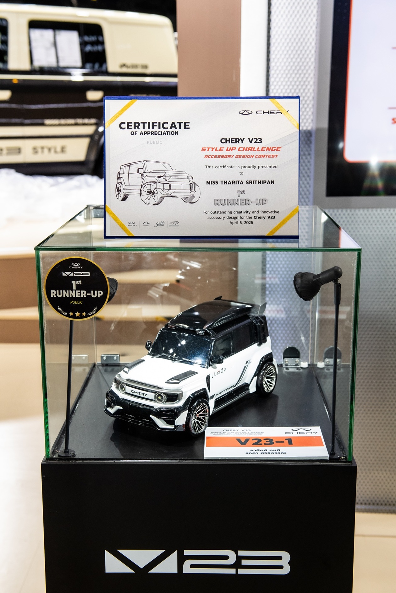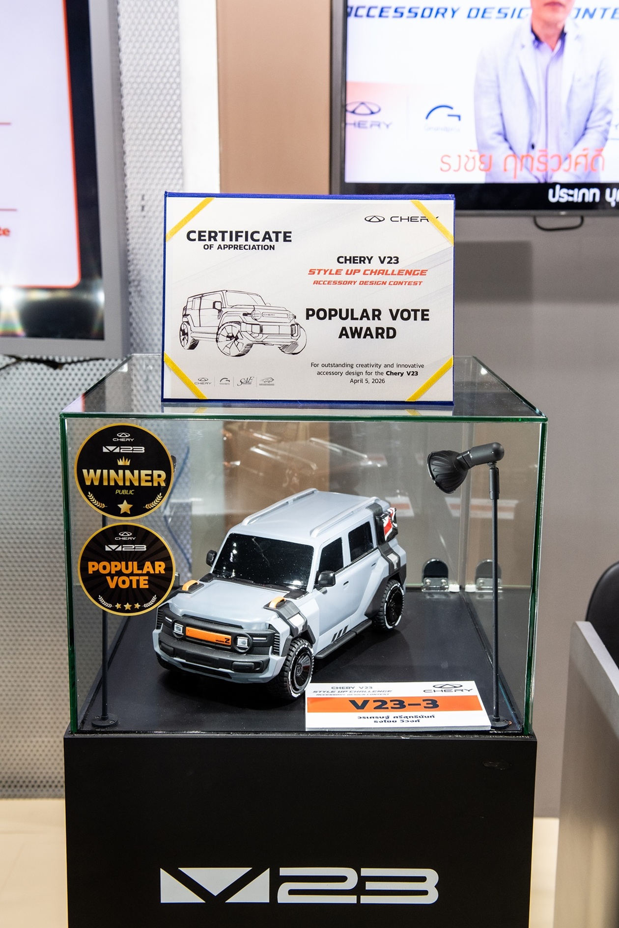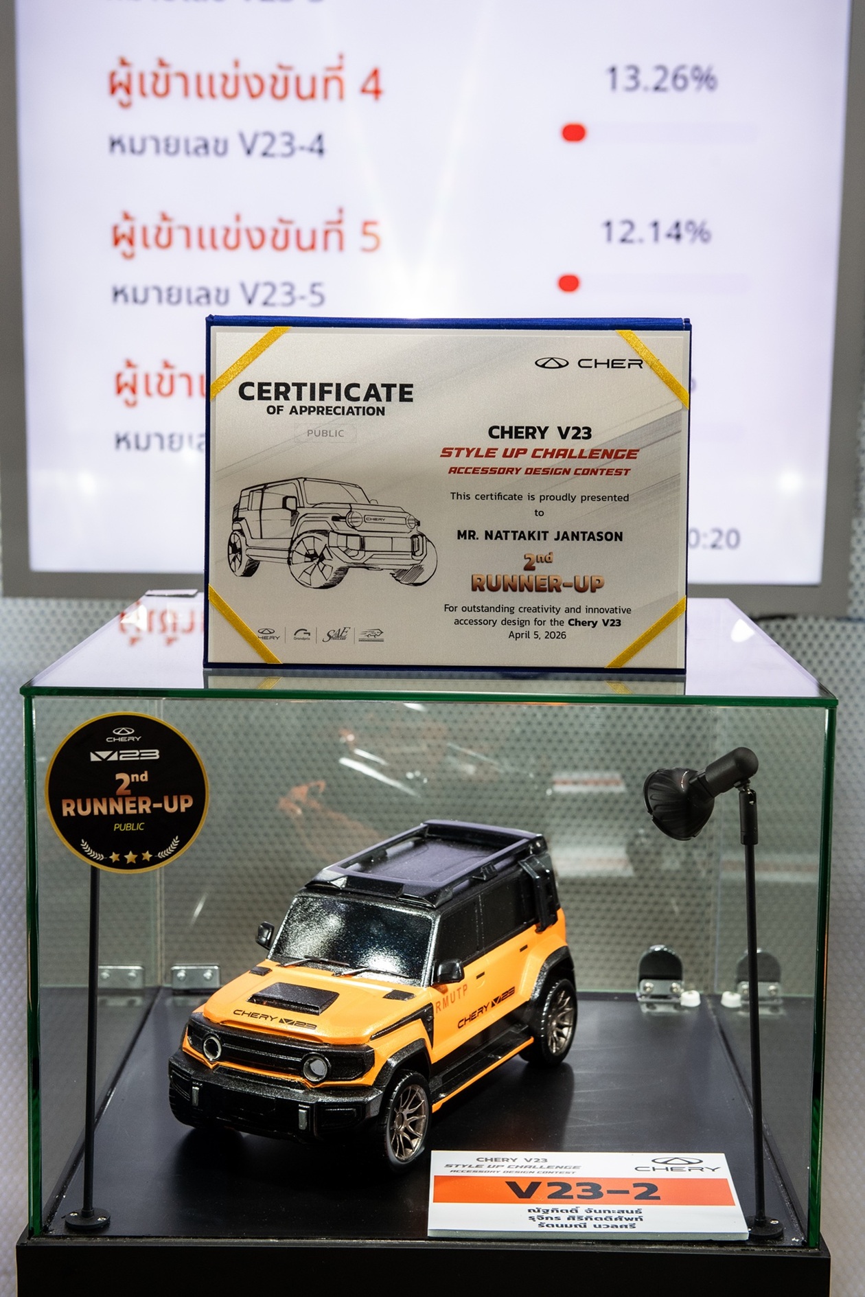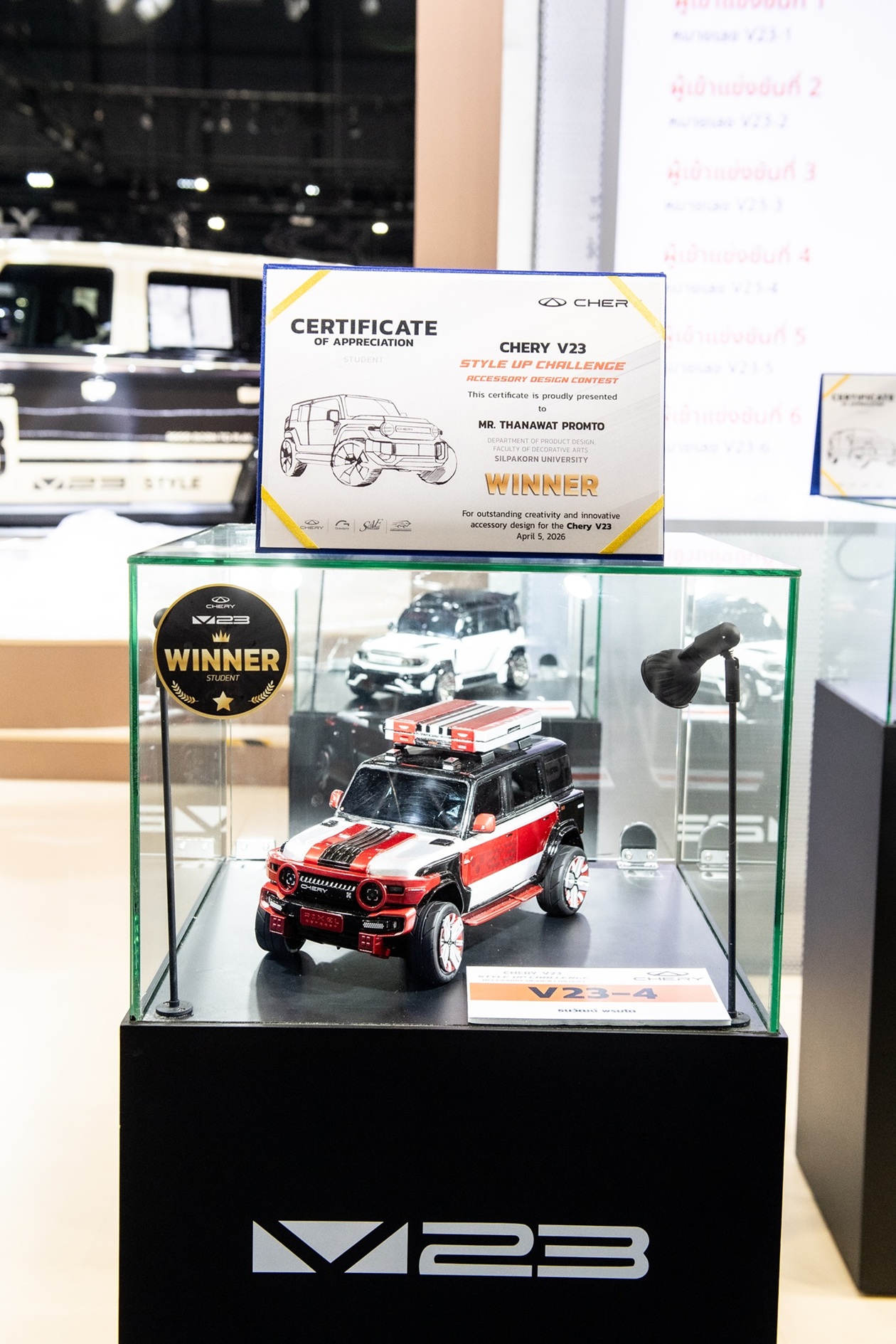 เชอรี ประเทศไทย ร่วมกับ สมาคมวิศวกรรมยานยนต์ไทย บริษัท กรังด์ปรีซ์ อินเตอร์เนชั่นแนล จำกัด (มหาชน) และสมาคมผู้สื่อข่าวรถยนต์และรถจักรยานยนต์ไทย(สรยท.) จัดพิธีมอบรางวัลโครงการประกวดออกแบบอุปกรณ์ตกแต่งรถยนต์ “Chery V23 Style Up Challenge” อย่างเป็นทางการ ณ บูธรถยนต์ CHERY ภายในงาน บางกอก อินเตอร์เนชั่นแนล มอเตอร์โชว์ ครั้งที่ 47 อาคารชาเลนเจอร์ 1–3 อิมแพ็ค เมืองทองธานี เมื่อวันที่ 5 เมษายน 2569 ท่ามกลางบรรยากาศคึกคัก โดยมีผู้บริหาร พันธมิตรในอุตสาหกรรม และสื่อมวลชนร่วมเป็นสักขีพยาน
