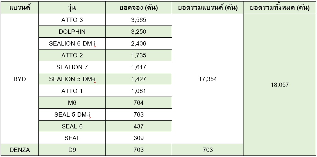 · แบ่งออกได้เป็น ยอดจองรถยนต์ BYD จำนวน 17,354 คัน และ DENZA จำนวน 703 คัน