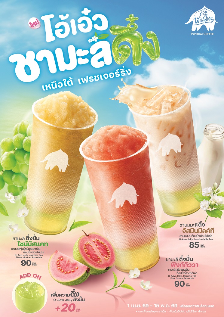 พิเศษ! เพิ่มเพียง 20 บาท ก็ได้ Add on โอ้เอ๋วได้แบบจุกๆ มาร่วมพิสูจน์ความอร่อย สดชื่น และสนุกไปกับสเต็ปความดึ๋งได้ตั้งแต่วันที่ 1 เมษายน 2569 – 15 พฤษภาคม 2569 (หรือจนกว่าสินค้าจะหมด) ที่ร้านพันธุ์ไทยทุกสาขาที่ร่วมรายการ และเดลิเวอรีจัดส่งความดึ๋งถึงบ้าน ติดตามความเคลื่อนไหวได้ที่ www.facebook.com/punthaicoffee และ www.tiktok.com/@punthai_coffee_official