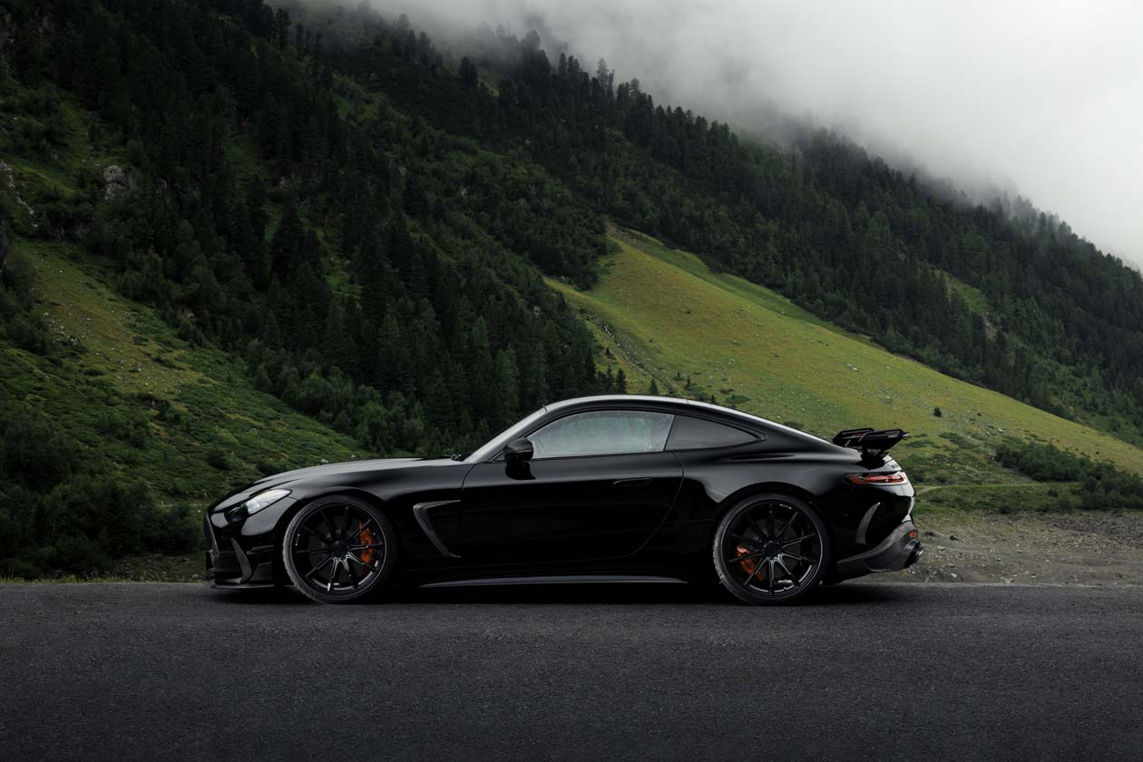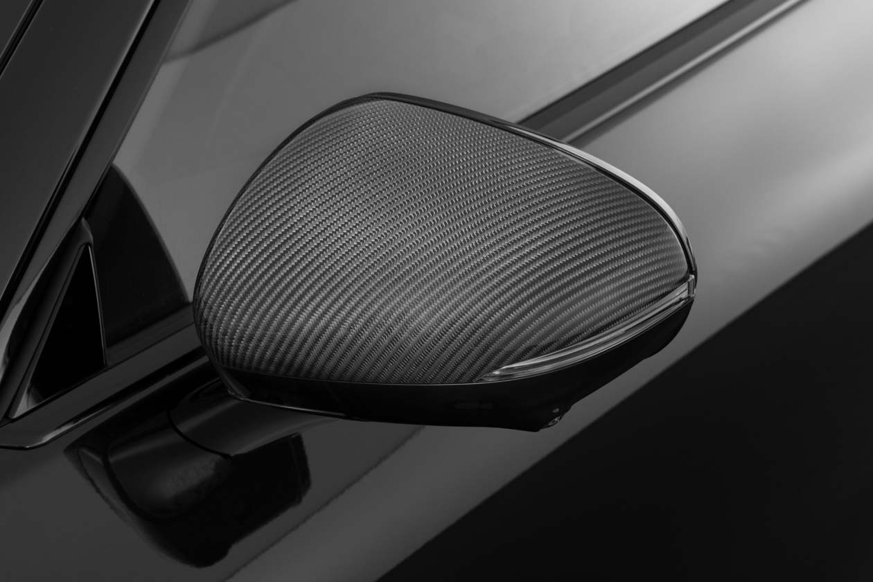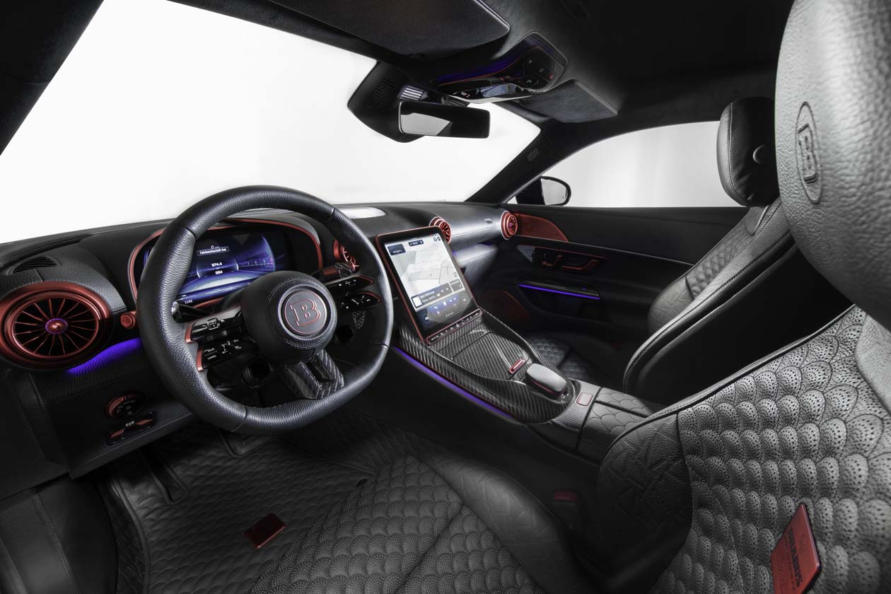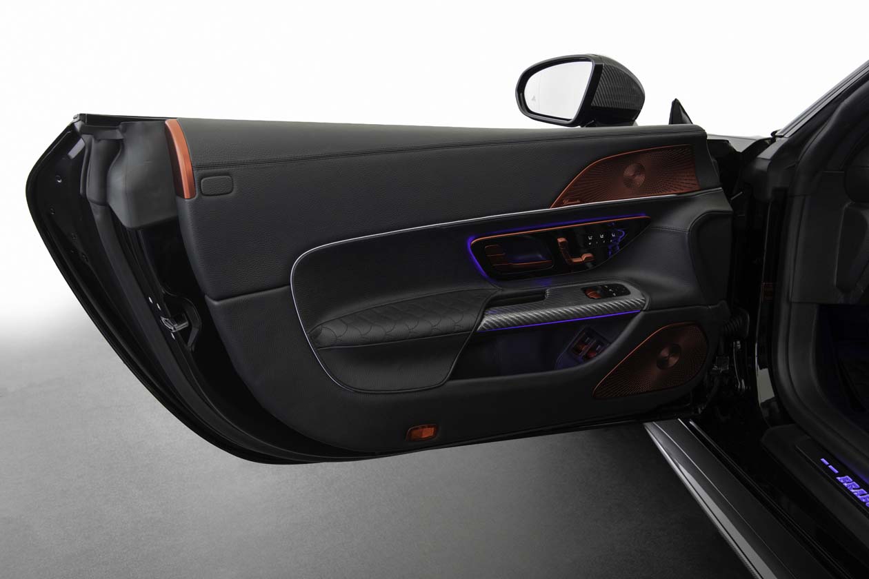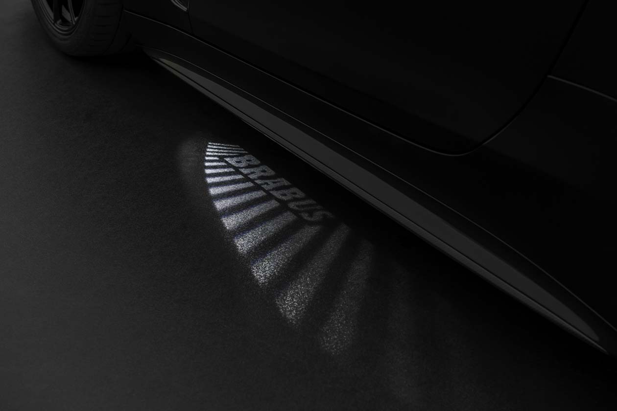 แนวข้างตัวรถ ยังมีส่วนขยายดีไซน์บริเวณหลังซุ้มล้อหน้า (Design Extensions Aft of the Front Wheel Arches) ซึ่งทำหน้าที่เป็น “ลายเซ็น” ของ BRABUS ควบคู่กับฝาครอบกระจกมองข้างคาร์บอน และระบบไฟใต้ท้องรถที่ฉายโลโก้ BRABUS ลงพื้นเมื่อเปิดประตู