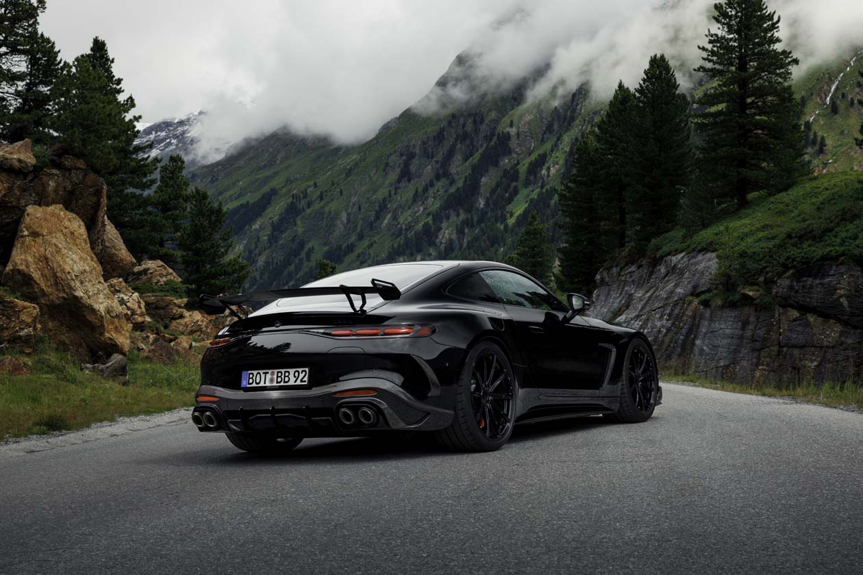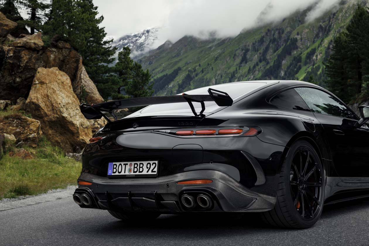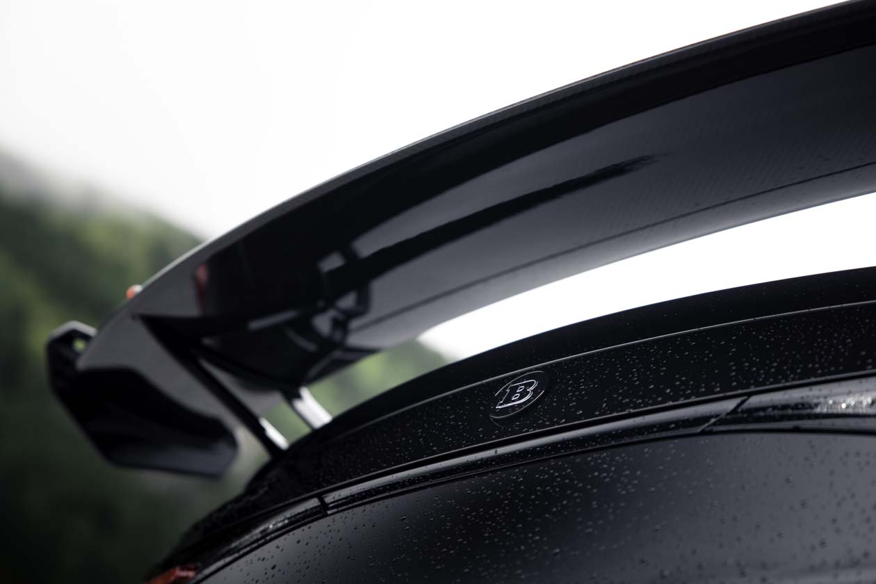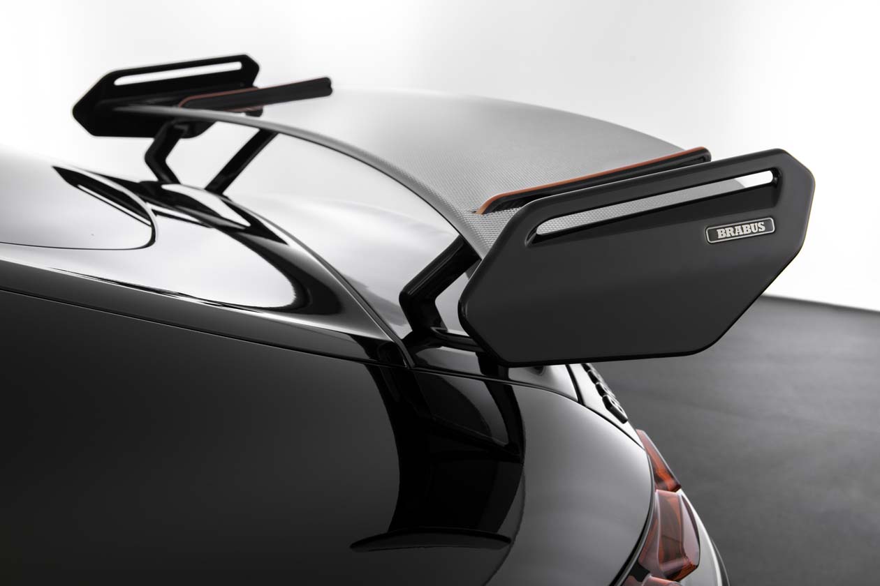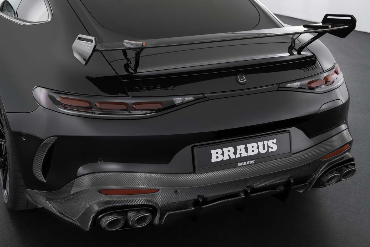 ท้ายรถถูกทำให้ “เป็นระบบ” ด้วยดิฟฟิวเซอร์คาร์บอน (BRABUS Carbon Diffuser) ที่เจาะช่องรองรับปลายท่อไอเสีย 4 ท่อ ขนาด 76 มิลลิเมตร และเพิ่มปีกหลัง BRABUS Rear Wing มีบทบาทเพิ่มแรงกดที่เพลาหลังเมื่อใช้ความเร็วสูง