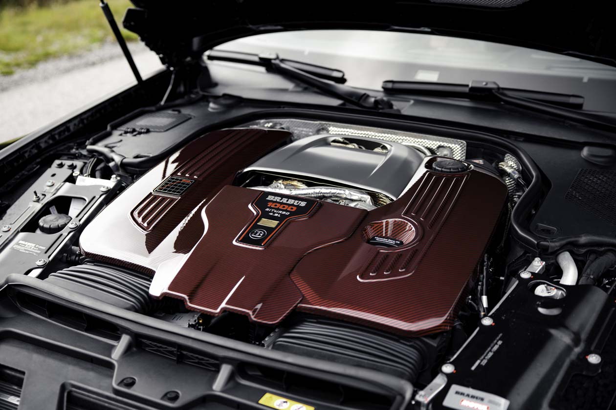 ใต้ฝาครอบเครื่องยนต์ที่ทำจากคาร์บอนไฟเบอร์ (Red Exposed-structure Carbon) เป็นระบบอัดอากาศ-เทอร์โบคู่ของ BRABUS ส่วนการระบายไอเสีย ถูกยกระดับด้วยท่อไอเสียสเตนเลส (BRABUS Stainless High-performance Exhaust System) ที่ใช้เมทัลแคต (Metal Catalysts) และไส้กรองอนุภาค (Particulate Matter Filters) ในการควบคุมมลพิษจากการเผาไหม้ โดยมีวาล์วผีเสื้อควบคุมด้วยอิเล็กทรอนิกส์ (Electronically Controlled Butterfly Valves) ให้ผู้ขับเลือกคาแร็กเตอร์เสียงได้ ตั้งแต่โหมด “Coming home” ที่เน้นความสุภาพ ไปจนถึงโทนเสียง V8 ที่ดุดันขึ้นตามโหมดการขับ