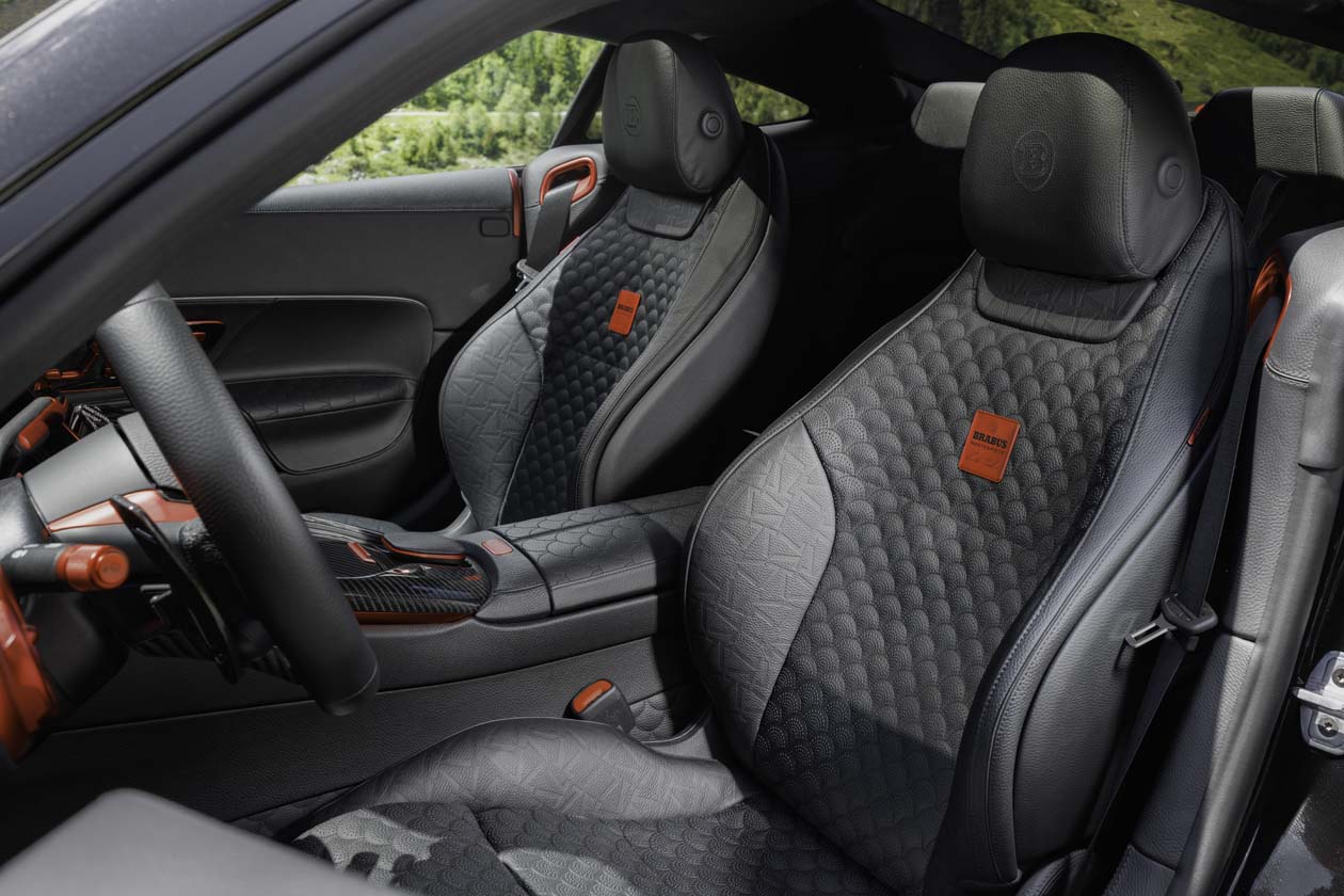 ในบางจุดบนตัวเบาะมีการใส่แพทเทิร์น “Heritage” เพื่อระลึกถึงการก่อตั้ง BRABUS ในปี 1977 ผ่านโลโก้ “77” แบบปั๊มนูน และเพื่อให้ความพิเศษทำงานร่วมกับบรรยากาศภายในแบบรถยุคใหม่ มีแผ่นกันรอยธรณีประตูคาร์บอนพร้อมโลโก้ BRABUS แบบมีไฟ (Carbon Scuff Plates with Backlit BRABUS Logo) ซึ่งเปลี่ยนสีไปพร้อมกับ Ambient Interior Lighting รวมถึงงานตกแต่งคาร์บอนจำนวนมาก